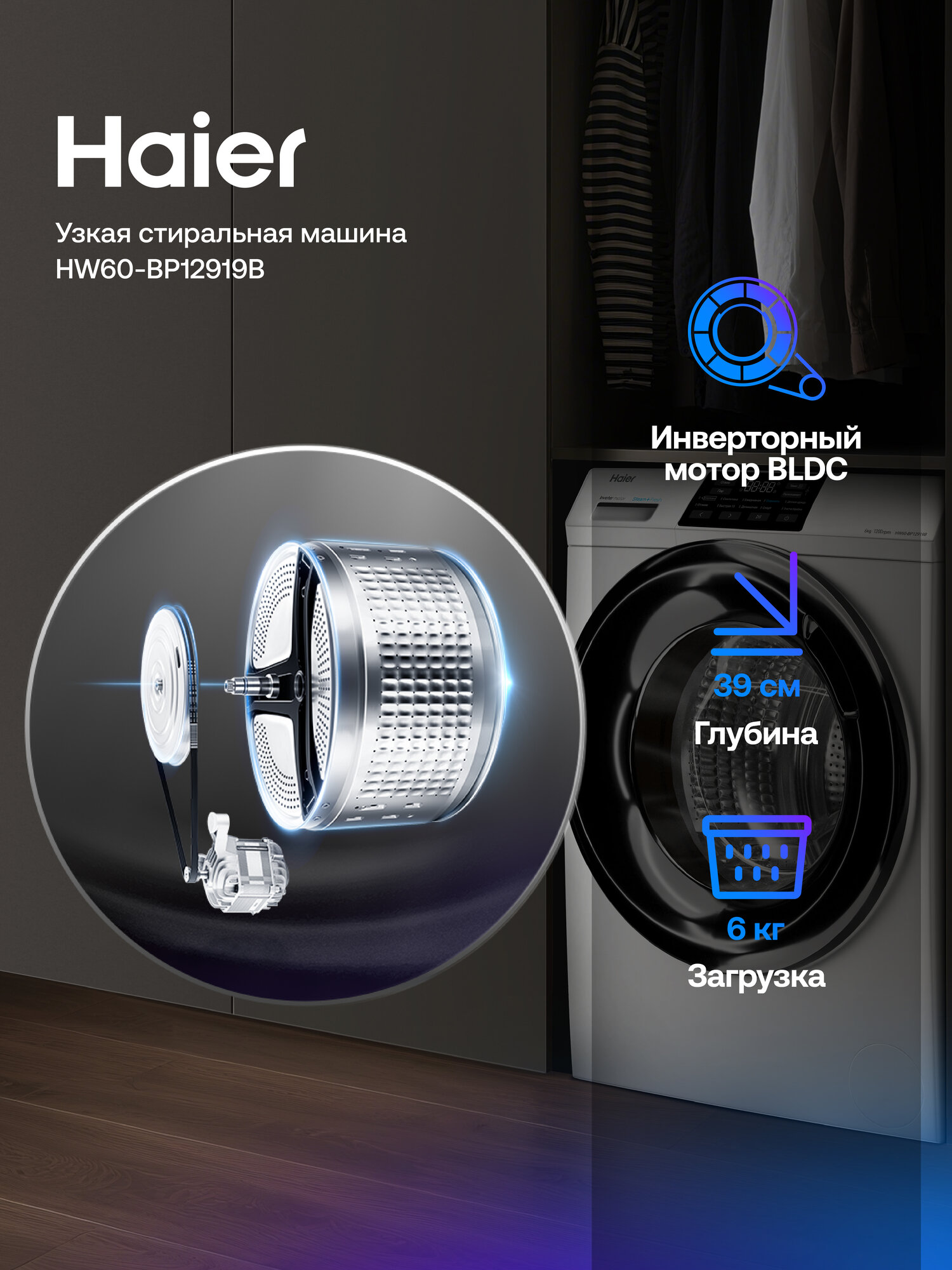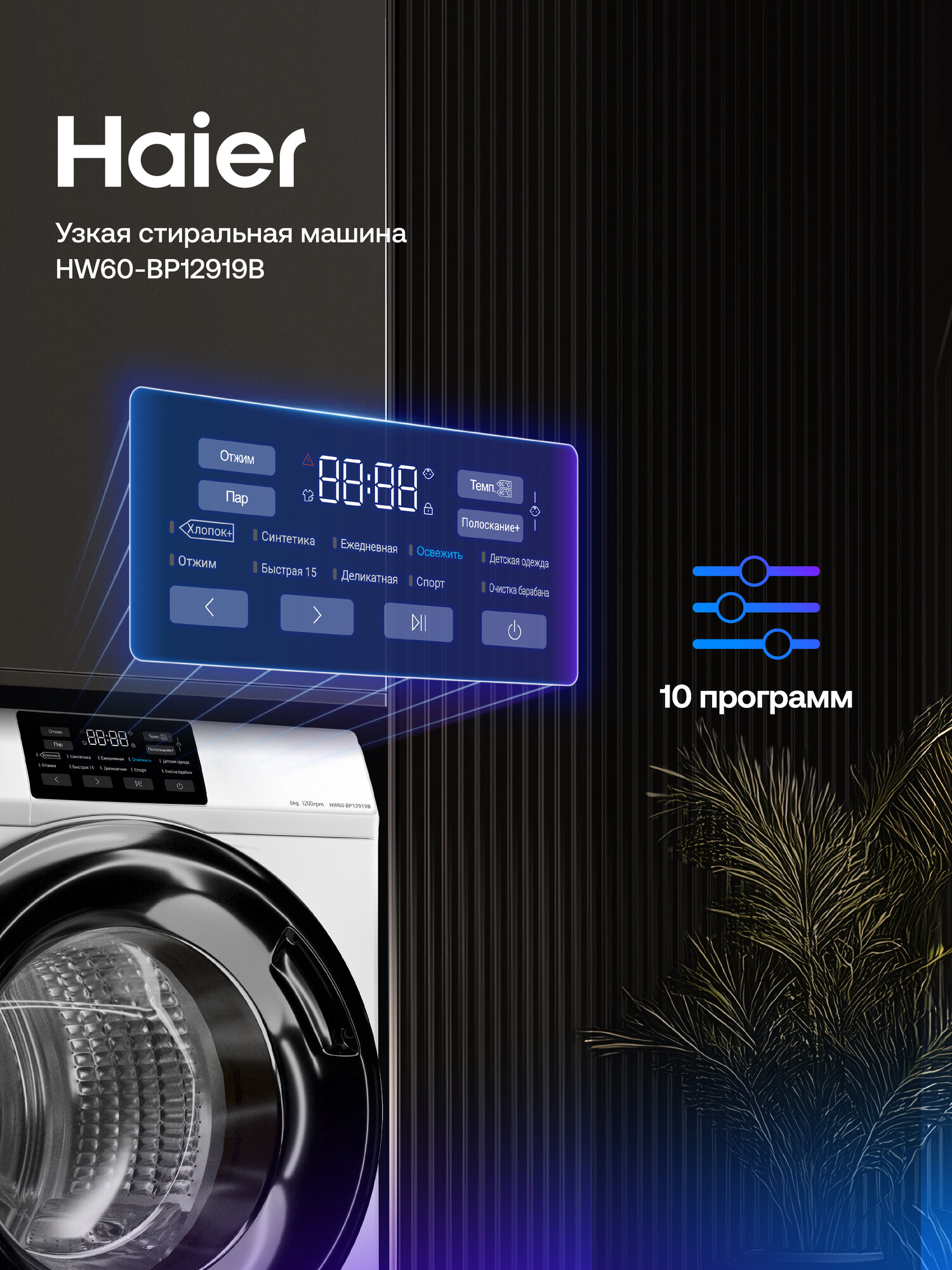 Стиральная машина HW60-BP12919B обладает оптимальным объёмом загрузки 6 кг, который одинаково хорошо подходит для ежедневной и интенсивной, объёмной стирки. Оптимизация времени стирки с функцией автовзвешивания Auto weighing позволит экономично расходовать воду, а инверторный мотор обеспечит тихую работу машинки. Интуитивное управление — понятный и удобный дисплей, который отображает время стирки, выбранную программу и дополнительно применённые опции, лёгкое переключение между режимами стирки. Регулируйте скорость отжима в зависимости от типа тканей или собственных пожеланий, используя широкий диапазон значений от 0 до 1200 оборотов. Стандартный набор программ, таких как «Хлопок», «Синтетика», «Смешанные ткани», «Шерсть» расширен функцией добавления пара, который разглаживает волокна ткани, делая одежду ещё более свежей и лёгкой.
