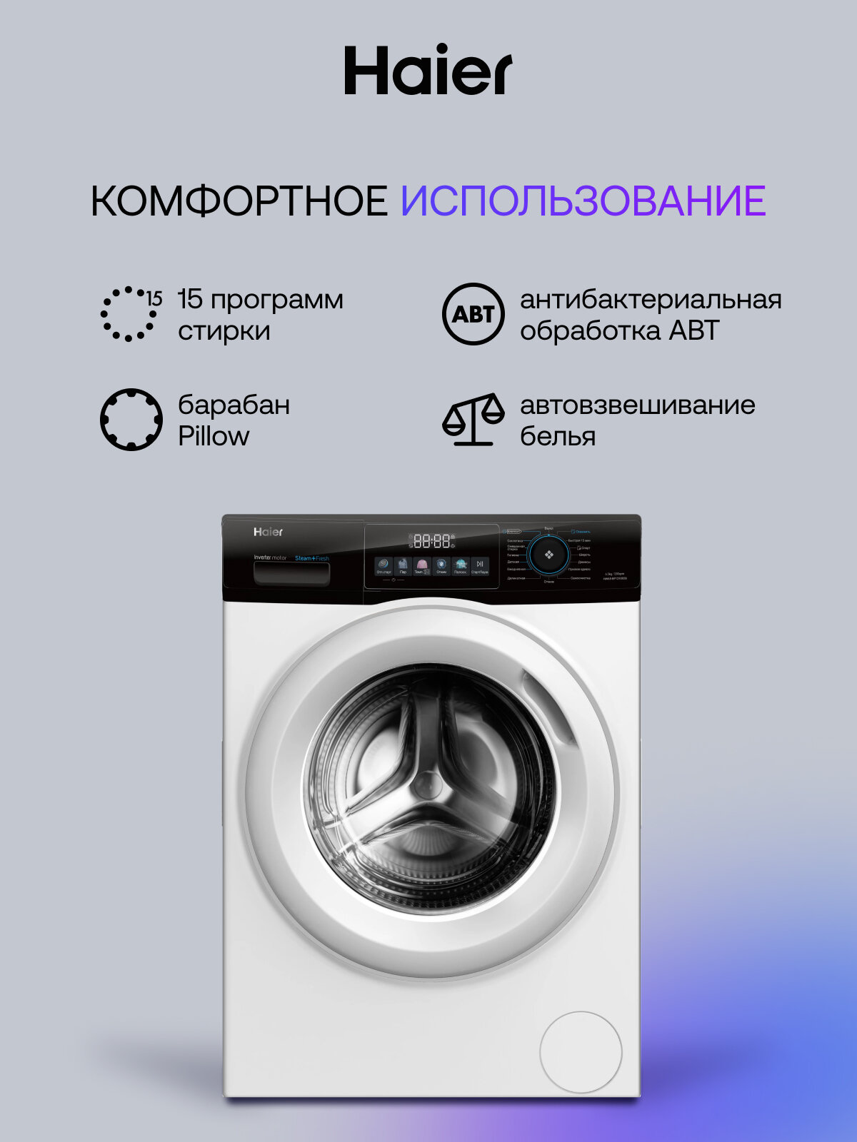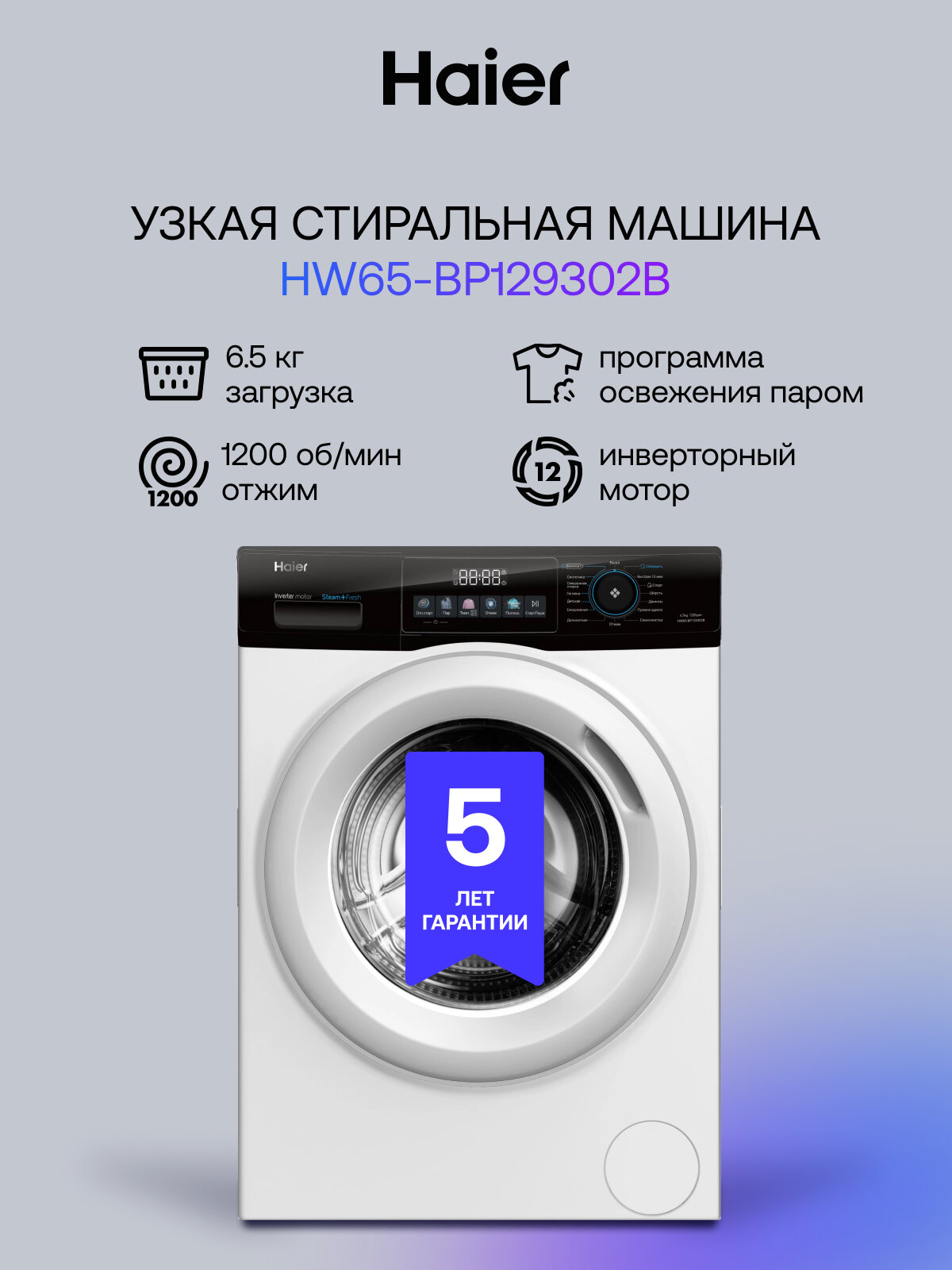 Стиральная машина Haier HW65-BP129302B с фронтальной загрузкой до 6.5 кг белья оснащена барабаном Pillow на 45 л. Антибактериальное покрытие ABT защищает от появления грибка и плесени, упрощает уход за техникой. При включении дверка автоматически закрывается, а после звукового сигнала об окончании стирки блокировка снимается. Система автовзвешивания помогает машинке экономить воду и электричество, основываясь на весе сухого белья. Техника Haier HW65-BP129302B оснащена простыми поворотными рычагами и сенсорными кнопками. Вы можете выбрать 15 программ стирки, использовать обработку вещей паром, вручную выбирать температуру нагрева воды и скорость отжима. Дисплей показывает всю информацию о цикле работы и время до окончания программы. Вы можете настроить таймер отсрочки до 24 ч и заблокировать управление от детей.