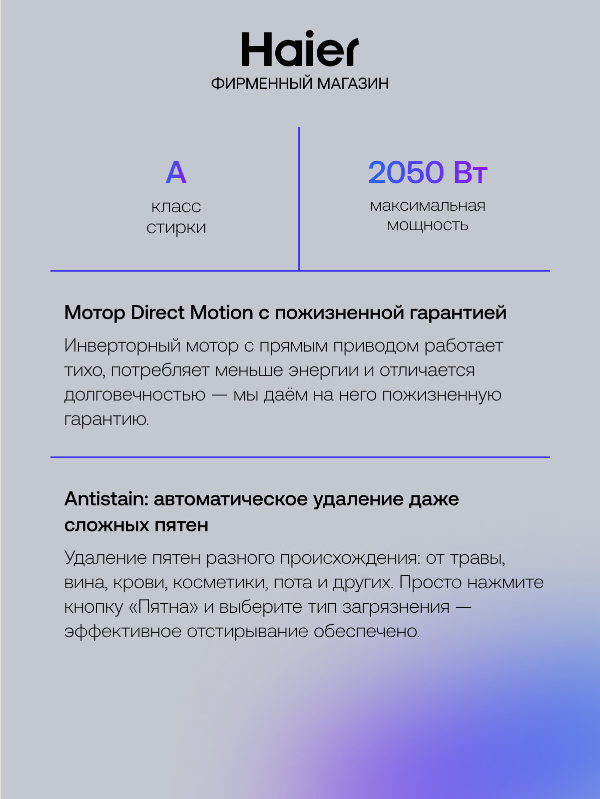| Дополнительные функции | автовзвешивание, автоматическая дозировка моющего средства, выбор скорости отжима, выбор температуры стирки, интеллектуальное управление стиркой, контроль баланса, контроль за уровнем пены, отложенный старт, очистка барабана, прямой впрыск, сигнал окончания стирки, установка времени завершения стирки |