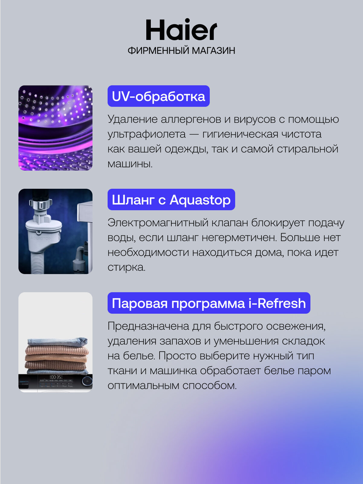 | Программы | быстрая стирка, гипоаллергенная стирка, дополнительное полоскание, ежедневная стирка, интенсивная стирка, ночной режим, отжим, полоскание, предварительная стирка, предотвращение сминания, стирка верхней одежды, стирка деликатных тканей, стирка детских вещей, стирка одеяла, стирка пуховых вещей, стирка синтетики, стирка смешанных тканей, стирка спортивной одежды, стирка хлопка, стирка шелка, стирка шерсти, удаление пятен, экономичная программа |