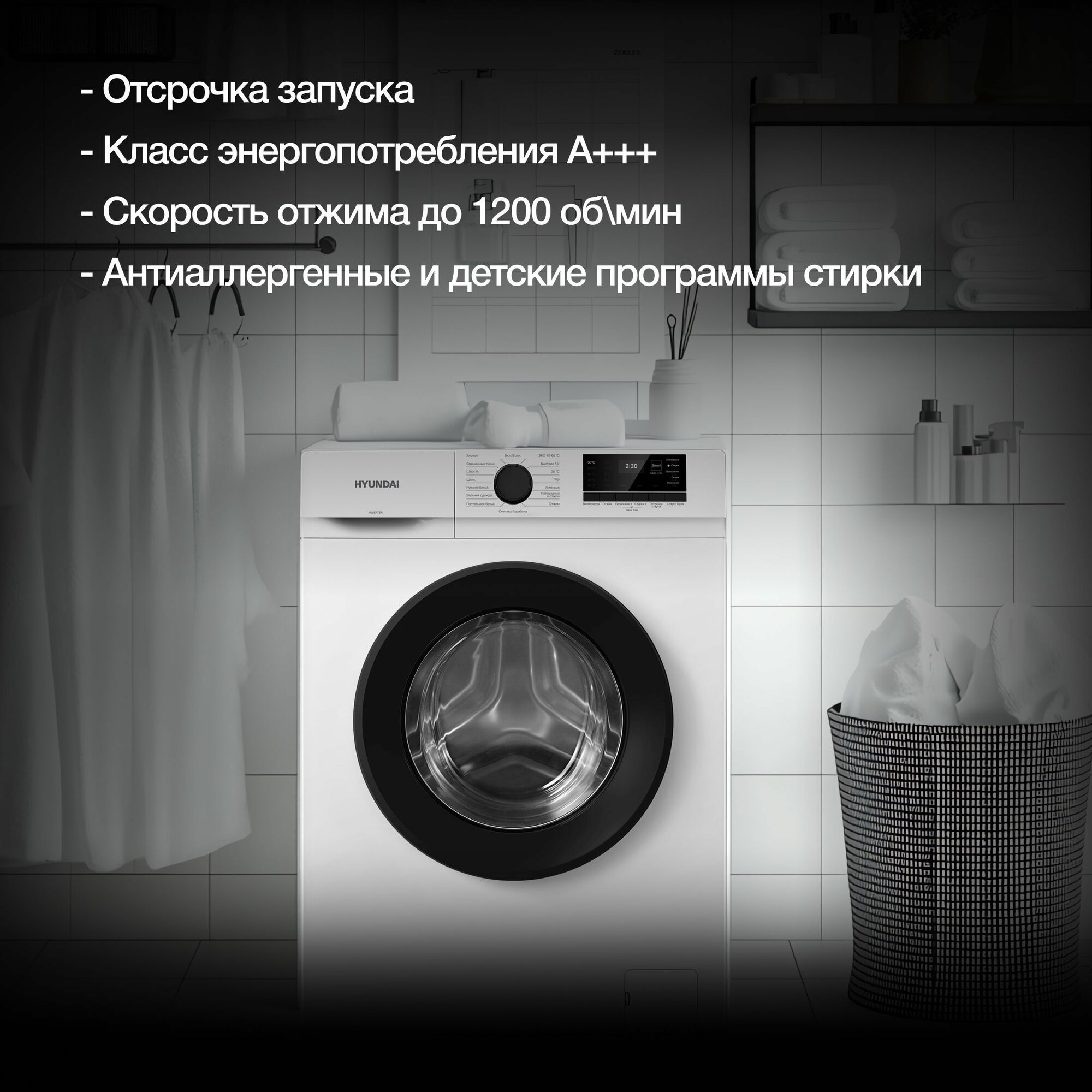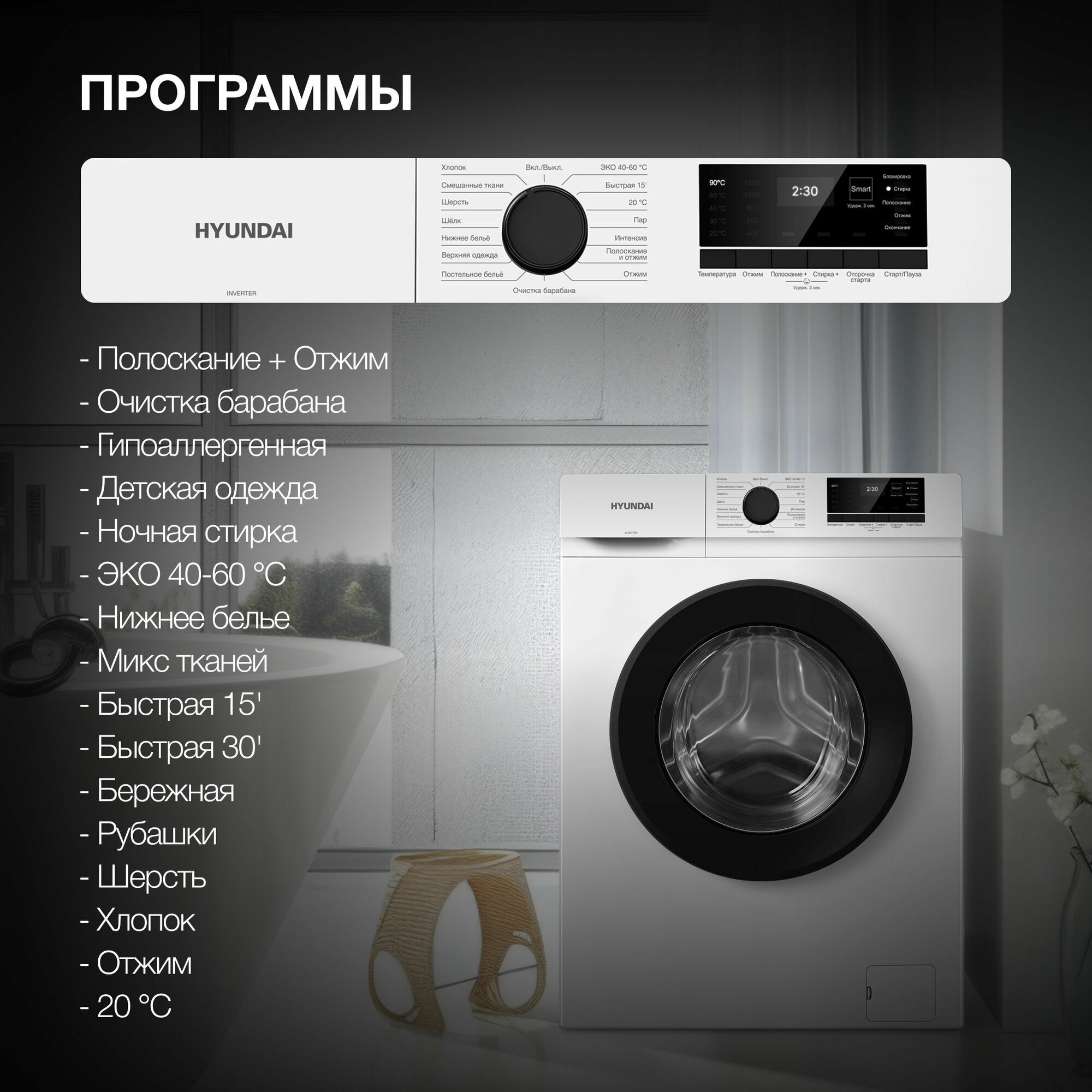 | Программы | био-фаза, быстрая стирка, гипоаллергенная стирка, дополнительное полоскание, ежедневная стирка, замачивание, интенсивная стирка, ночной режим, отжим, отмена отжима, подкрахмаливание белья, полоскание, предварительная стирка, предотвращение сминания, ручная стирка, стирка в большом количестве воды, стирка верхней одежды, стирка деликатных тканей, стирка детских вещей, стирка джинсов, стирка одеяла, стирка паром, стирка подушек, стирка пуховых вещей, стирка синтетики, стирка смешанных тканей, стирка спортивной обуви, стирка спортивной одежды, стирка хлопка, стирка цветных вещей, стирка черных вещей, стирка шелка, стирка шерсти, удаление пятен, экономичная программа |