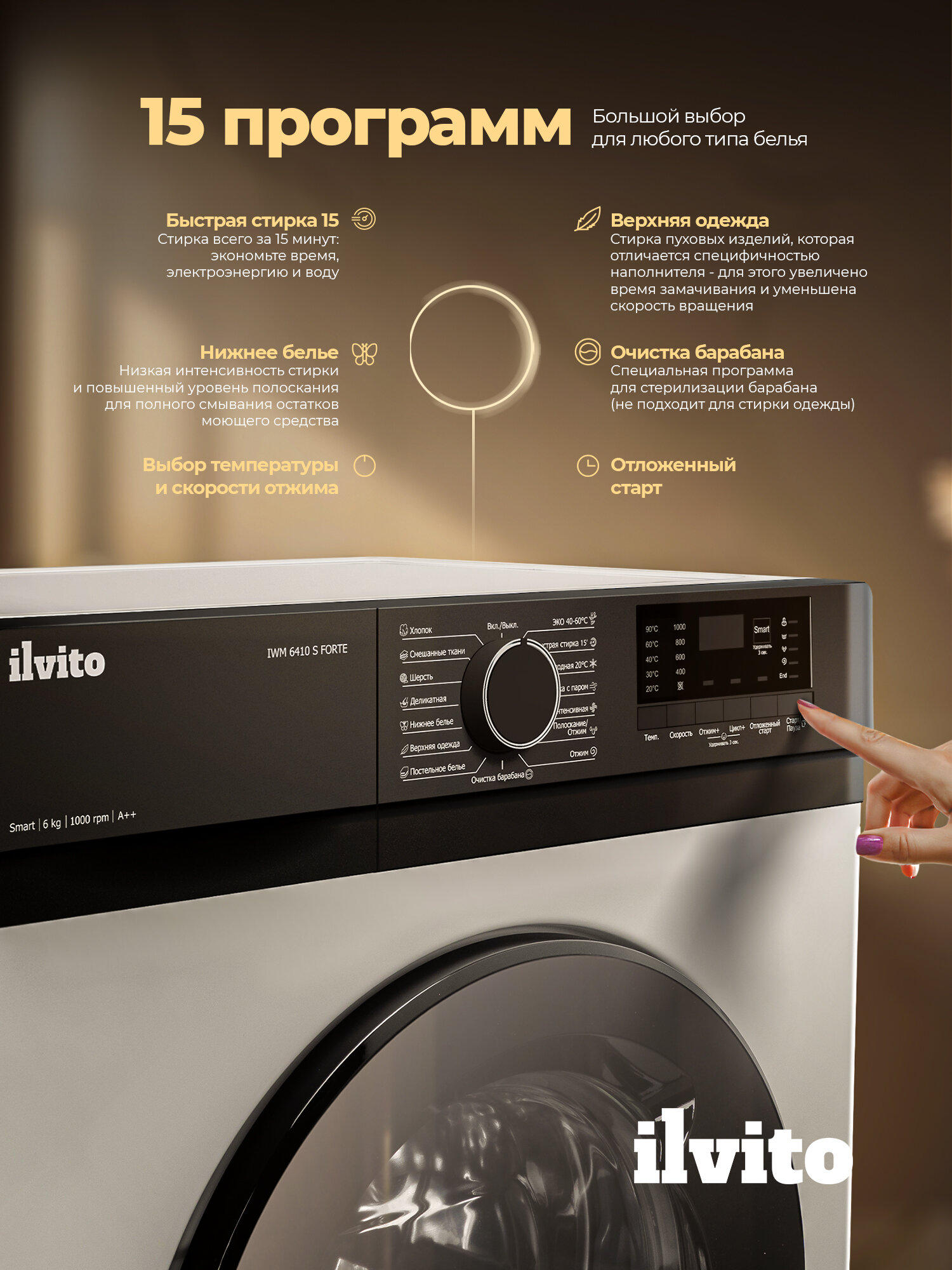 | Программы | быстрая стирка, гипоаллергенная стирка, дополнительное полоскание, ежедневная стирка, интенсивная стирка, отжим, отмена отжима, полоскание, предварительная стирка, ручная стирка, стирка верхней одежды, стирка деликатных тканей, стирка детских вещей, стирка одеяла, стирка паром, стирка пуховых вещей, стирка синтетики, стирка смешанных тканей, стирка спортивной одежды, стирка хлопка, стирка цветных вещей, стирка шелка, стирка шерсти, экономичная программа |