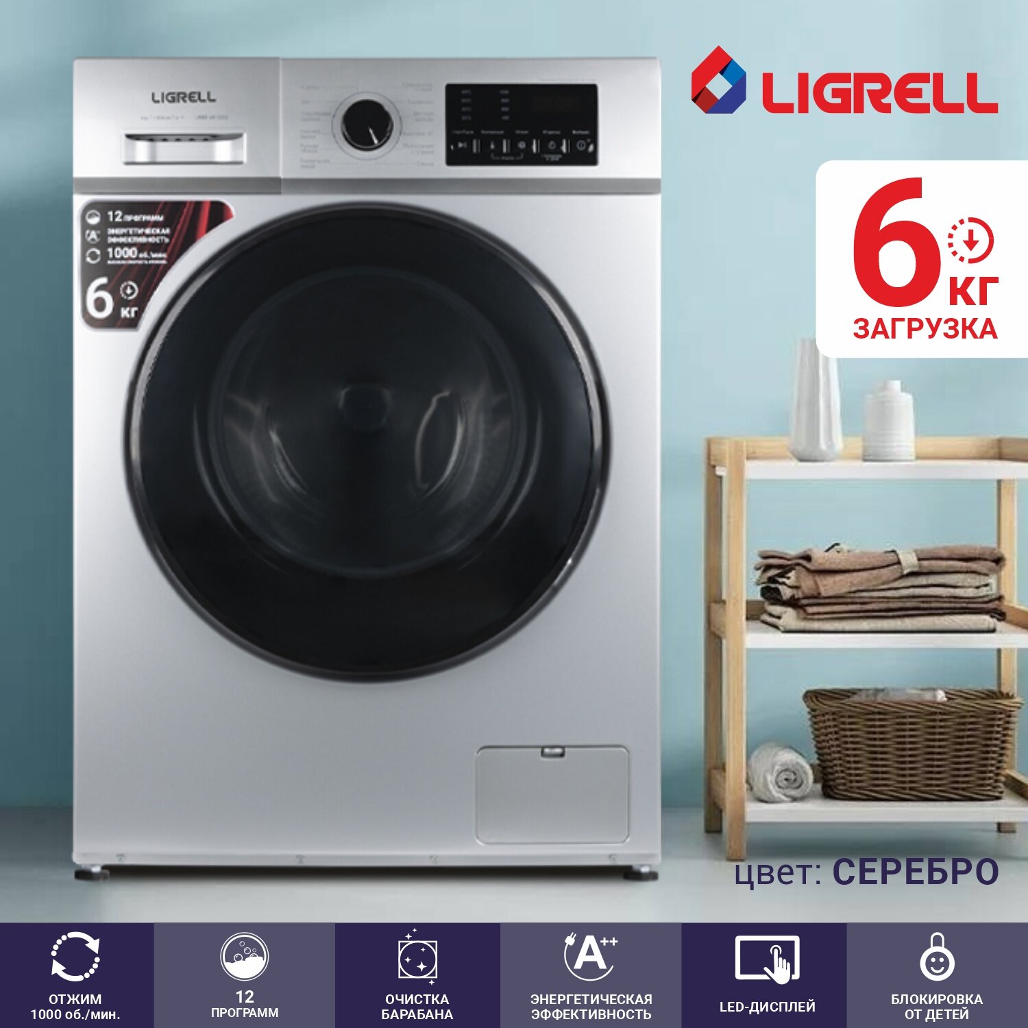 Стиральная машина LIGRELL LWM-6015BS, 12 пр, 6 кг, серая, A++