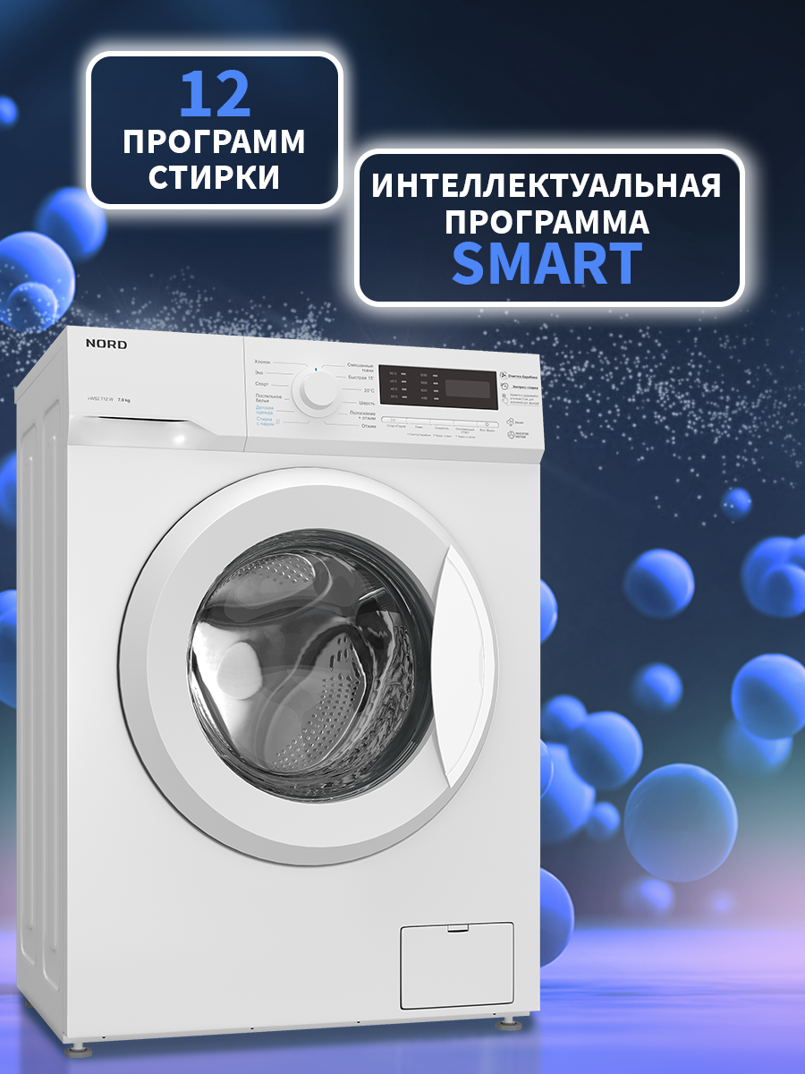 Инверторная стиральная машина NORD i-WS2 712 W с функцией стирки с паром порадует отличными показателями – она способна постирать до 7 кг белья за один цикл, а скорость отжима доходит до 1200 оборотов в минуту. Инверторный мотор работает тише стандартного, отличается долговечностью и способствует ресурсосбережению, что подтверждено высоким классом энергоэффективности А+++.