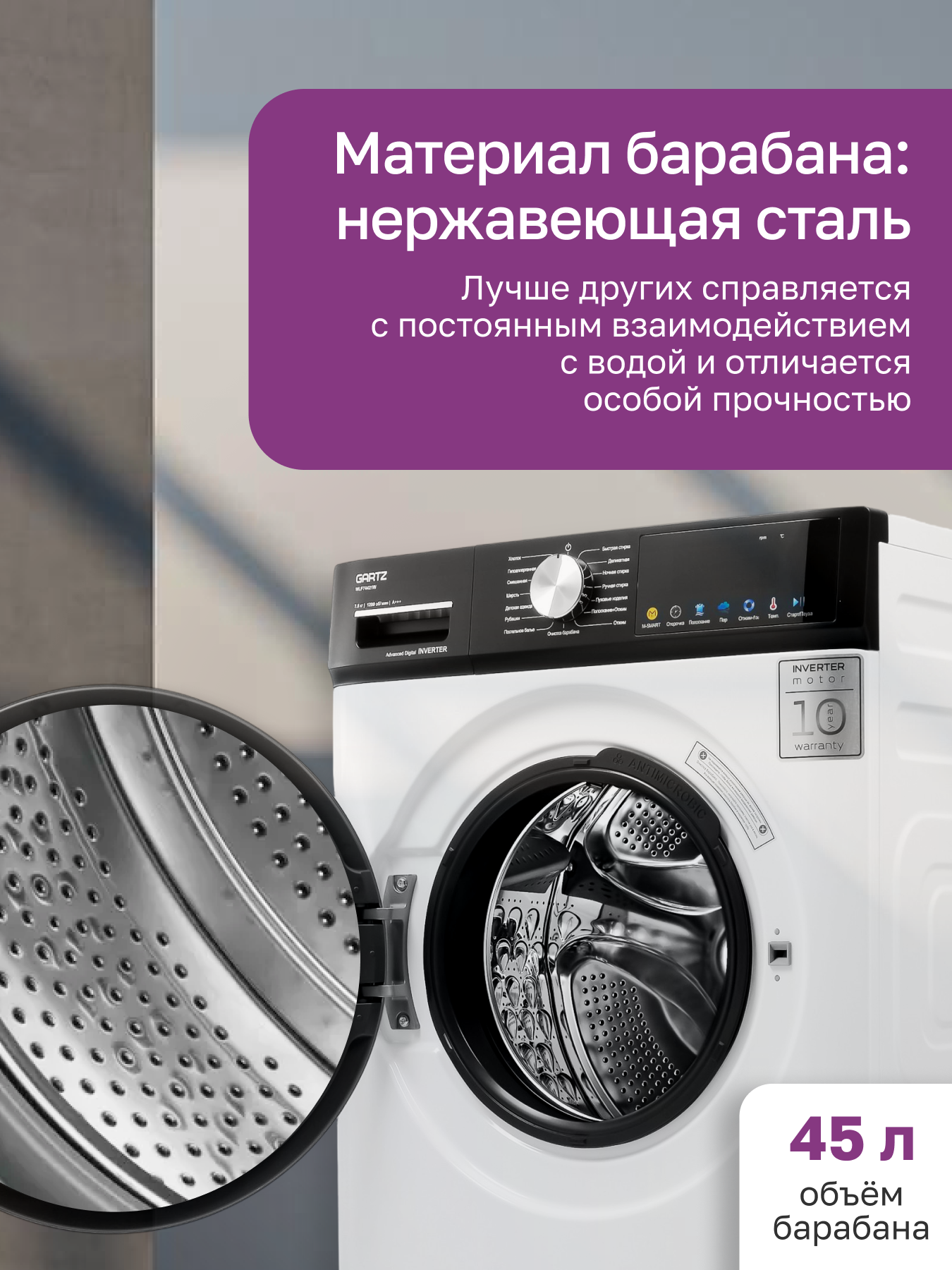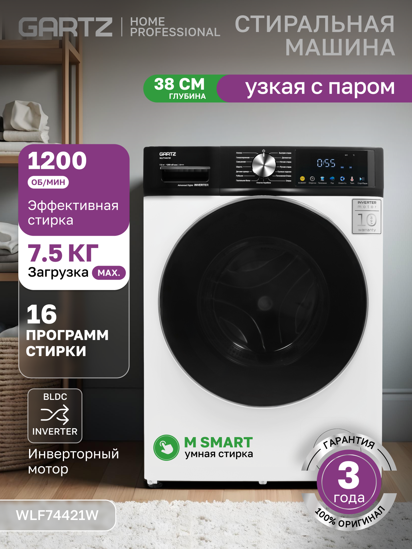 Стиральная машина с паром GARTZ WLF74421W HomeРrofessional, 38 см глубина, инверторный двигатель, 7,5 кг, 1200 об/мин, 16 программ, отсрочка старта, быстрая стирка, функция пара, умная стирка M-SMART, защита от протечек, белая: сравнение цен, характеристики, фото, актуальное наличие и цены.