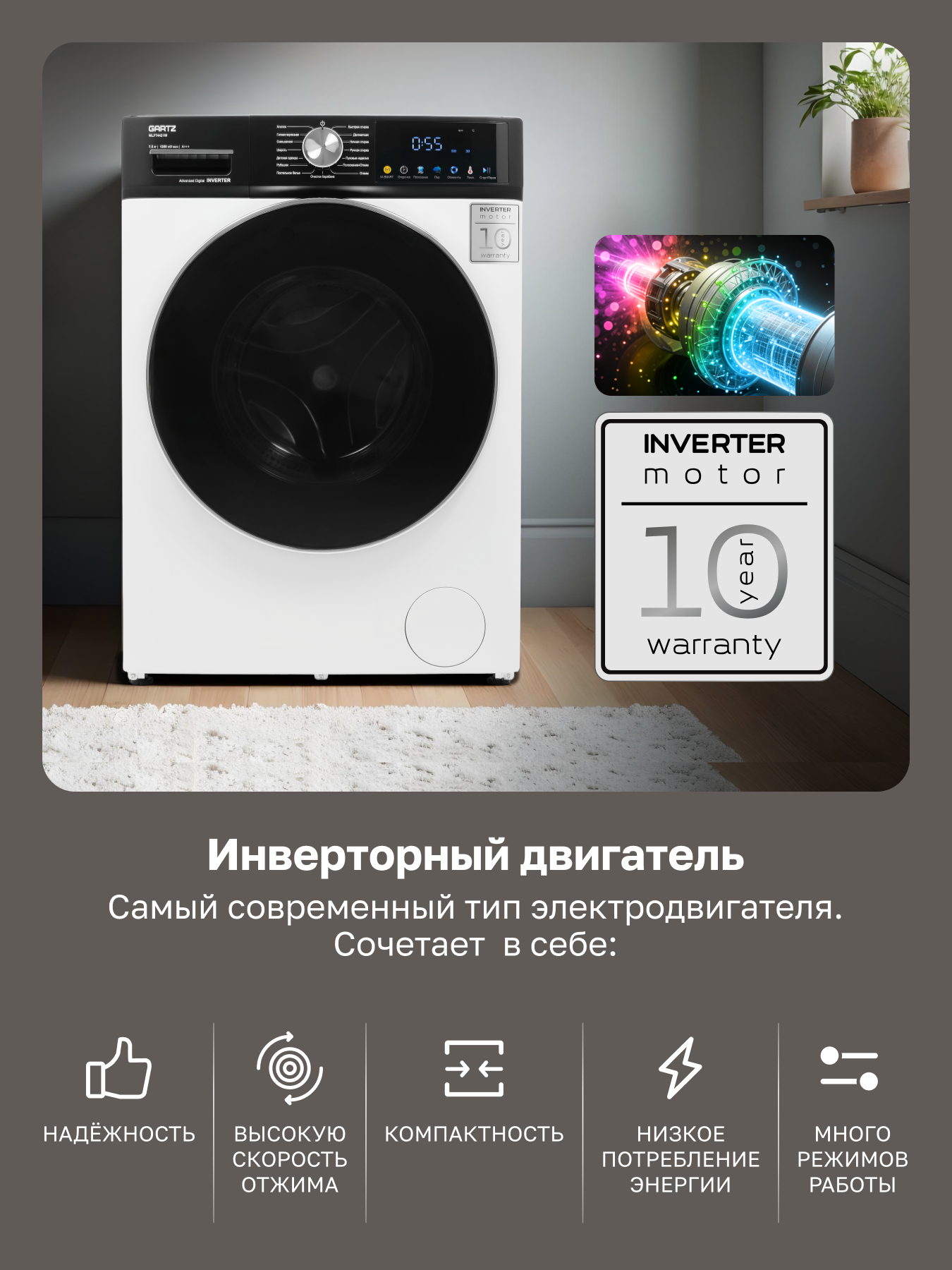 Купить Стиральная машина с паром GARTZ WLF74421W HomeРrofessional, 38 см глубина, инверторный двигатель, 7,5 кг, 1200 об/мин, 16 программ, отсрочка старта, быстрая стирка, функция пара, умная стирка M-SMART, защита от протечек, белая с доставкой по всей России.