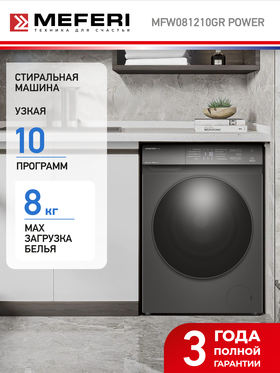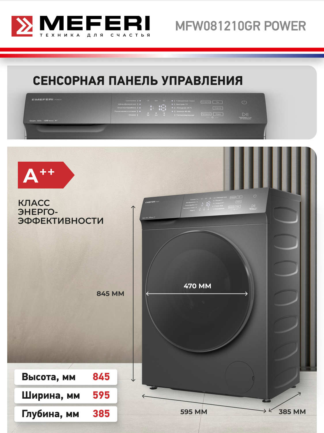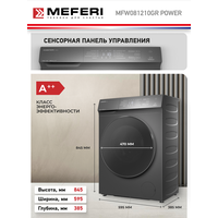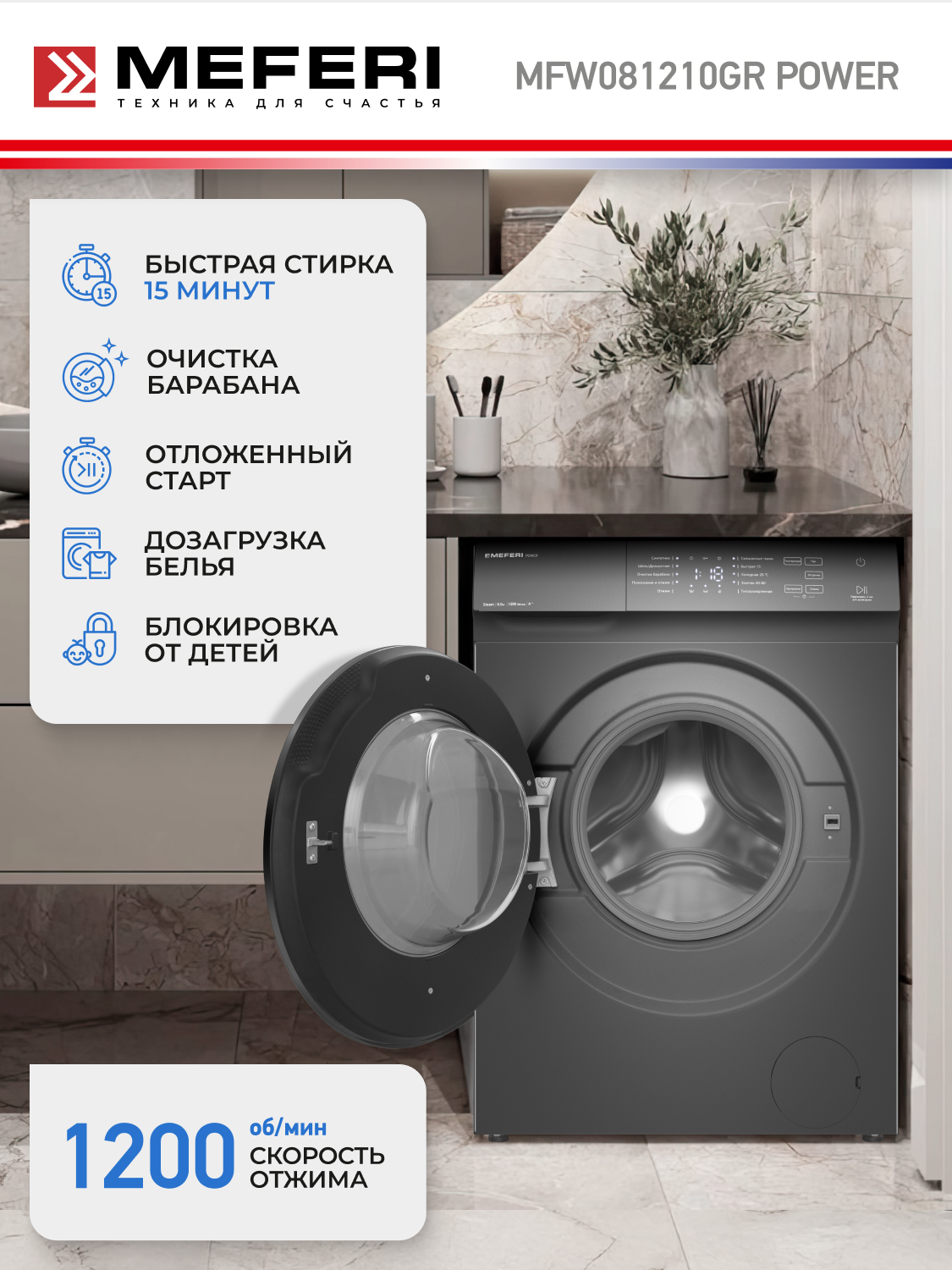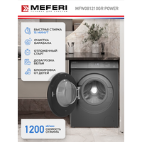 - Стиральная машина MEFERI MFW081210GR POWER также оснащена защитой от перелива и контролем пенообразования, что обеспечивает дополнительную безопасность и надежность в эксплуатации. Блокировка управления и люка защитит от случайных изменений настроек детьми.