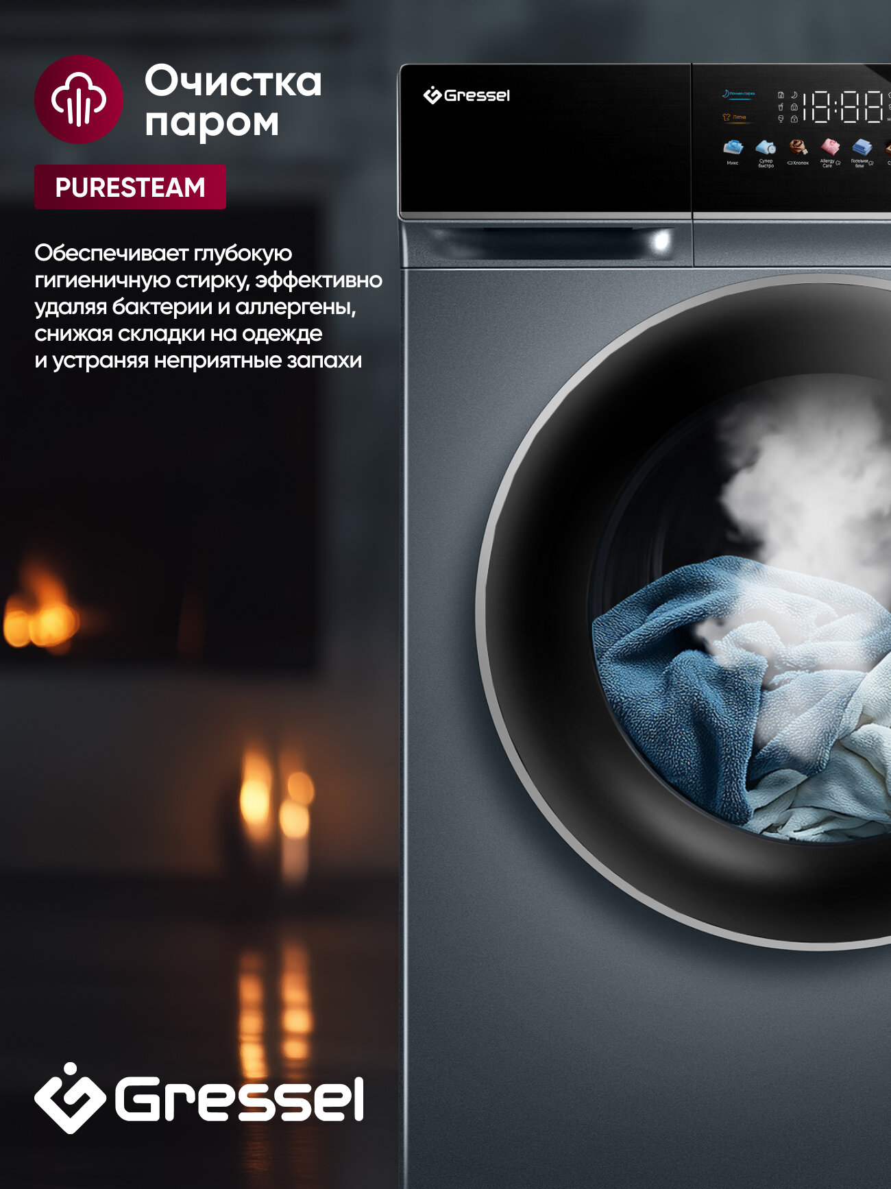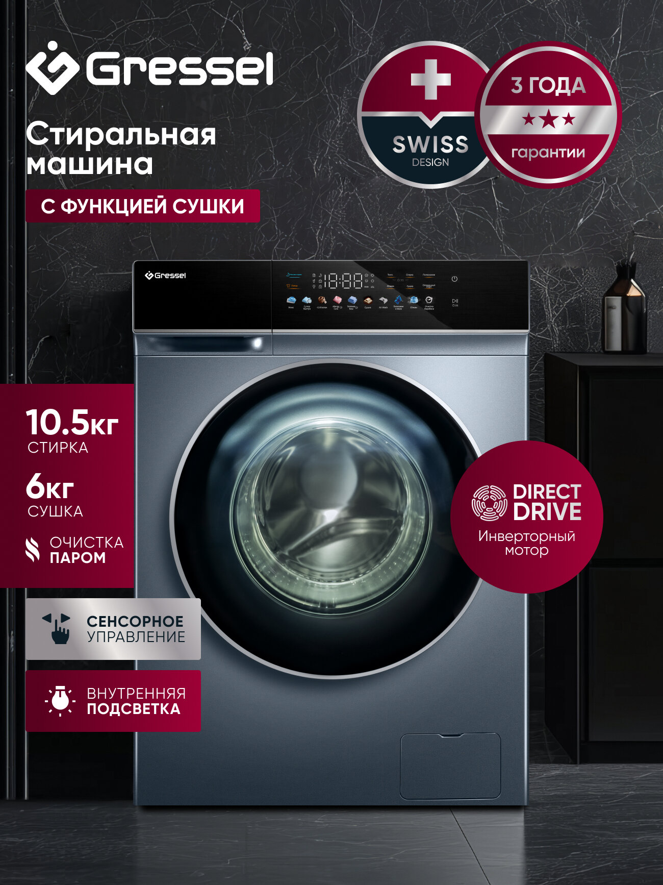 | Особенности конструкции | дисплей, открывание люка налево, подсветка барабана |