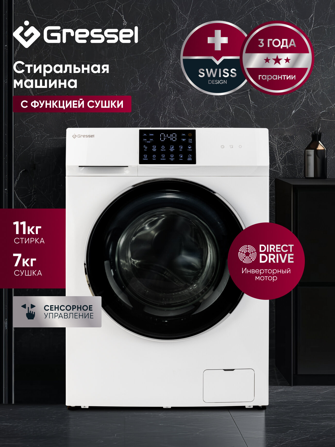 Купить Стиральная машина с сушкой Gressel USS602 (11 кг) инверторный мотор с прямым приводом 1200 оборотов с доставкой по всей России.