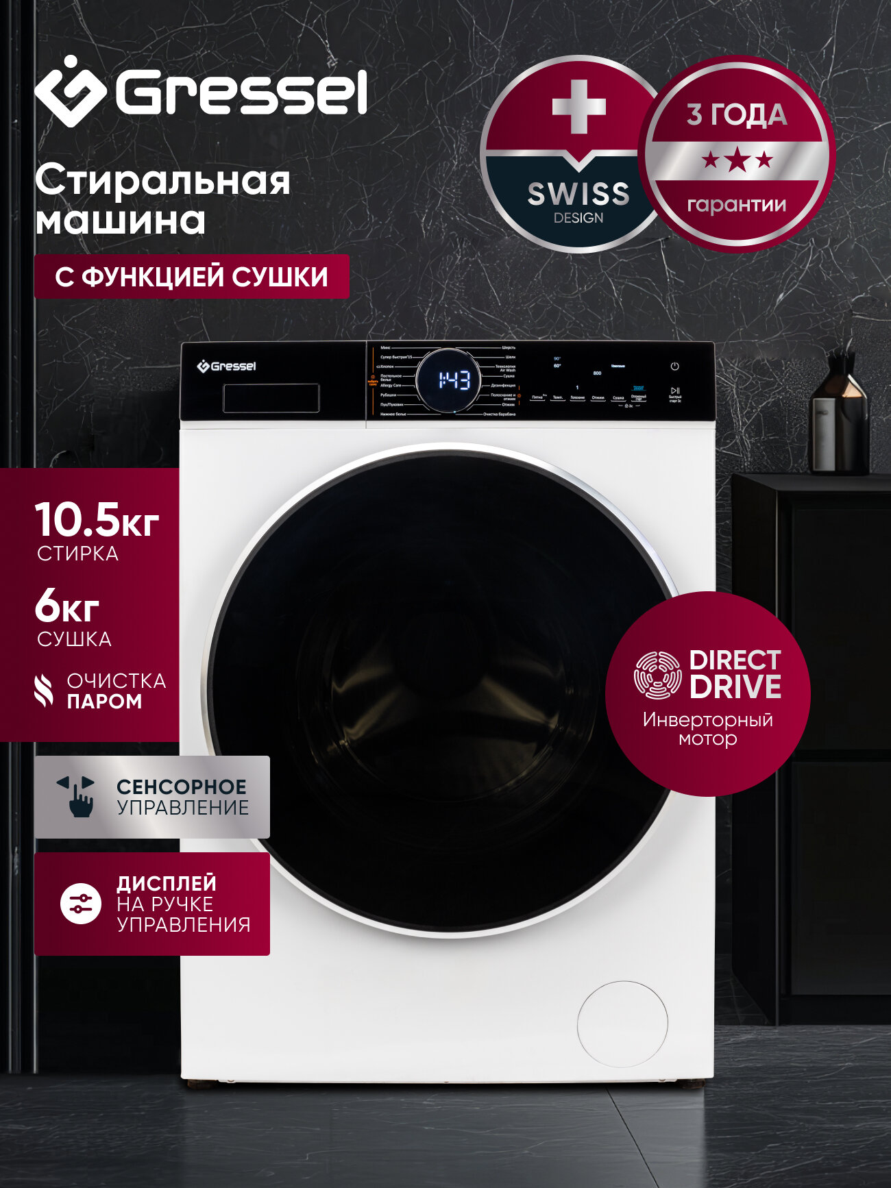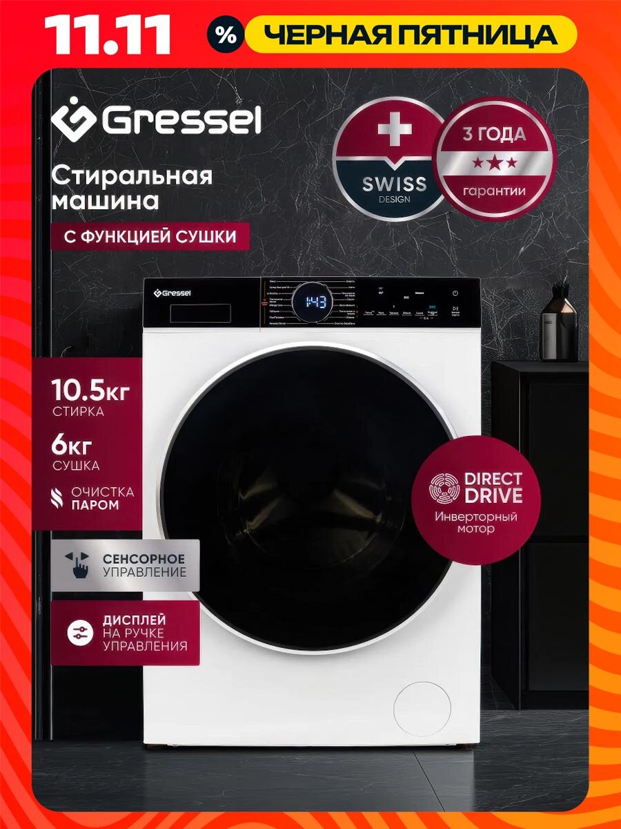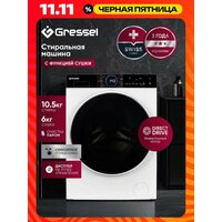 Стиральная машина с сушкой Gressel UWS601 (10,5 кг) с инверторным мотором Direct Drive, функцией пара PureSteam и функцией FlexiLoad дозагрузкой белья