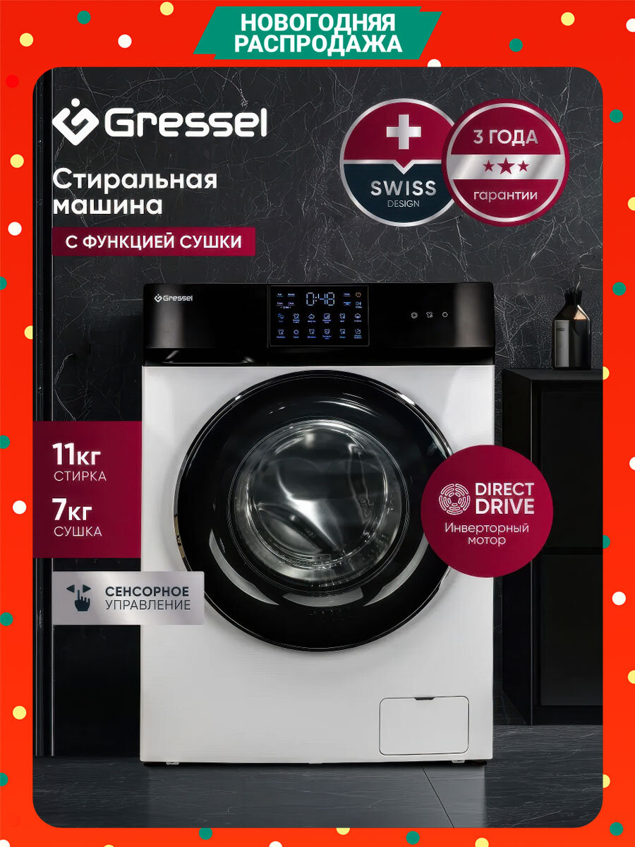 Стиральная машина с сушкой Gressel UWS602 (11 кг) с инверторным мотором Direct Drive, функцией пара PureSteam и дозагрузкой белья
