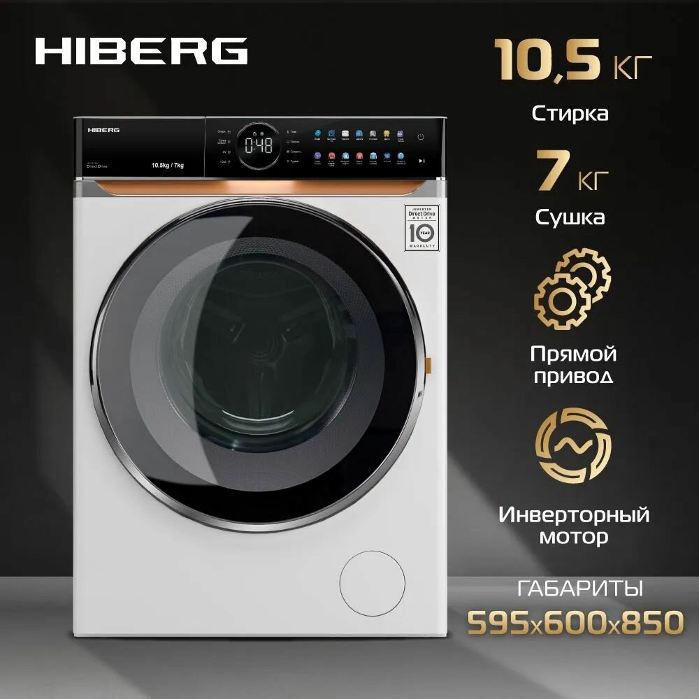 Стиральная машина с сушкой HIBERG i-DDQ10 - 10714 W с инверторным мотором и системой прямого привода отстирывает до 10,5 кг сухого белья за 1 цикл.