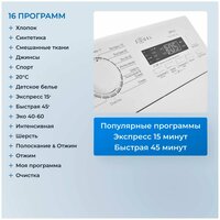 Стиральная машина оснащена электронным типом управления, имеет 16 программ стирки, включая быструю стирку, дополнительное полоскание, ежедневную стирку, стирку джинсов, стирку детских вещей, стирку смешанных тканей, стирку хлопка, стирку шерсти, экономичную программу, стирку синтетики, стирку спортивной одежды.