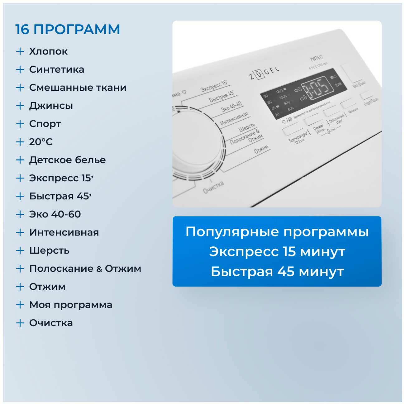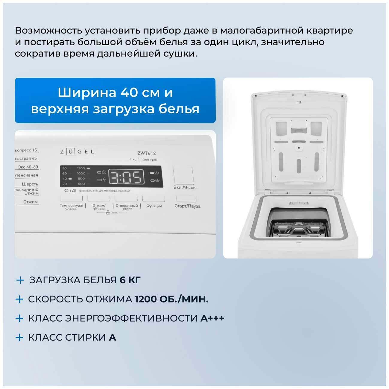 Стиральная машина ZUGEL ZWT612 с вертикальной загрузкой предлагает ряд эргономических преимуществ, которые делают ее подходящей для малогабаритных квартир. Удобный доступ к фильтру позволяет без усилий проводить обслуживание и уход за стиральной машиной, сохраняя ее работоспособность на долгие годы.