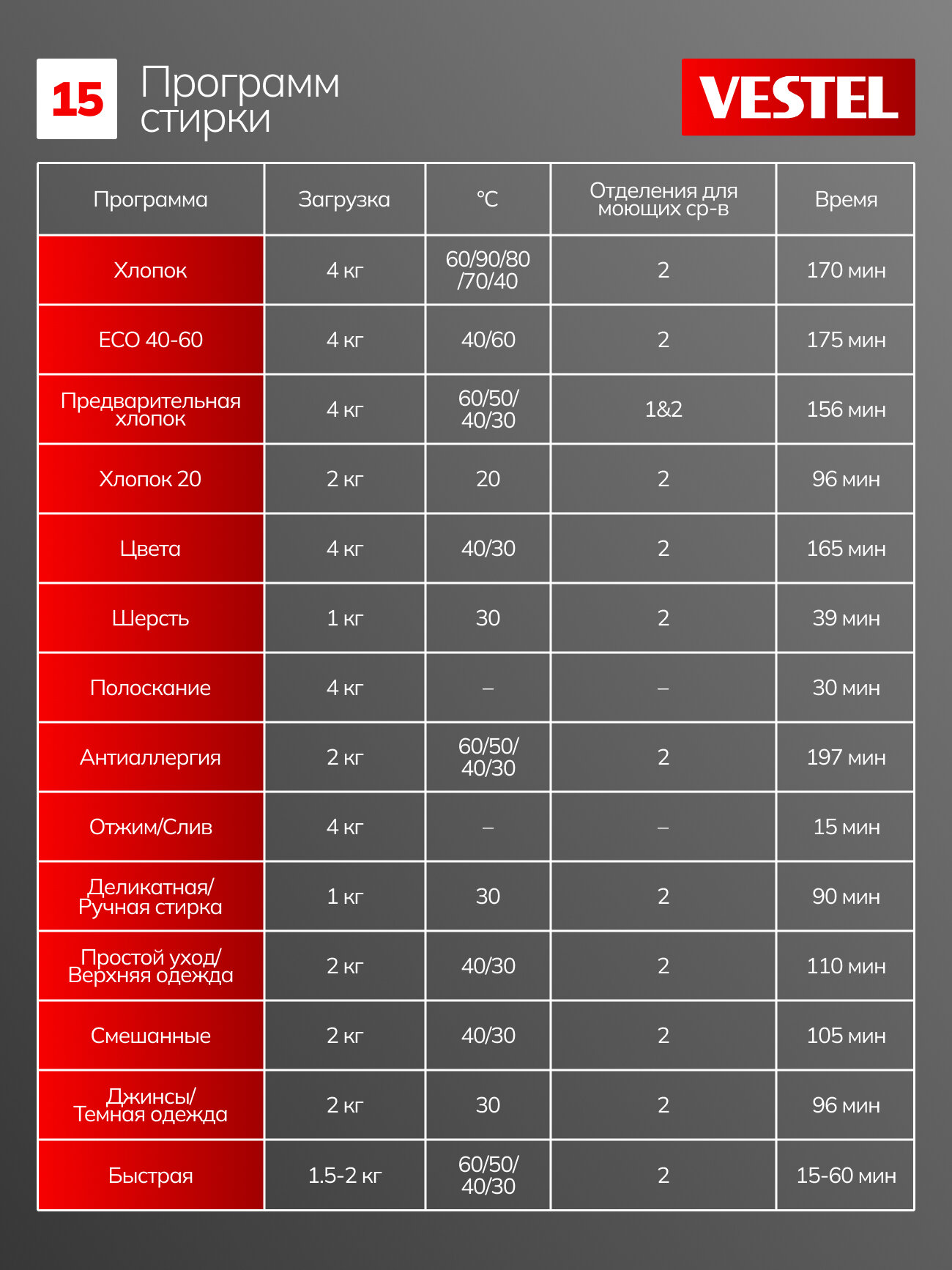 | Количество программ стирки | 15 |