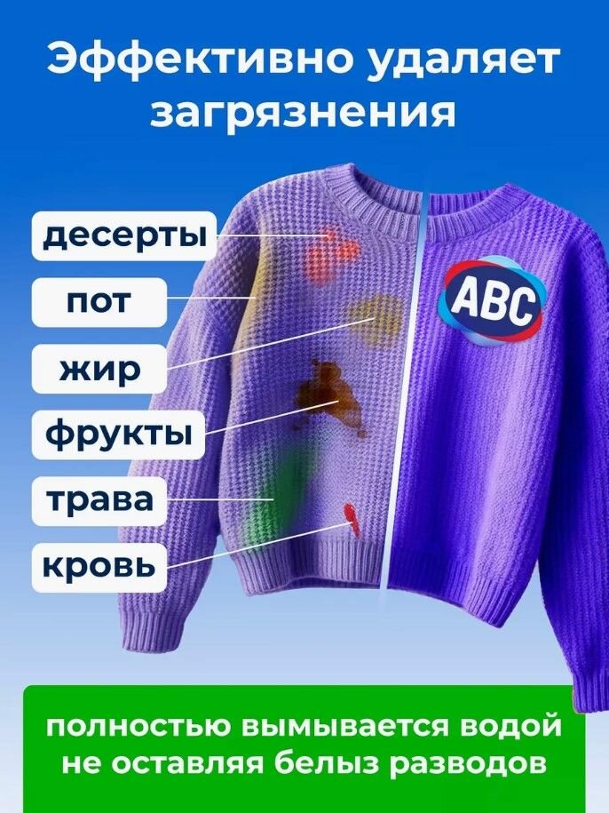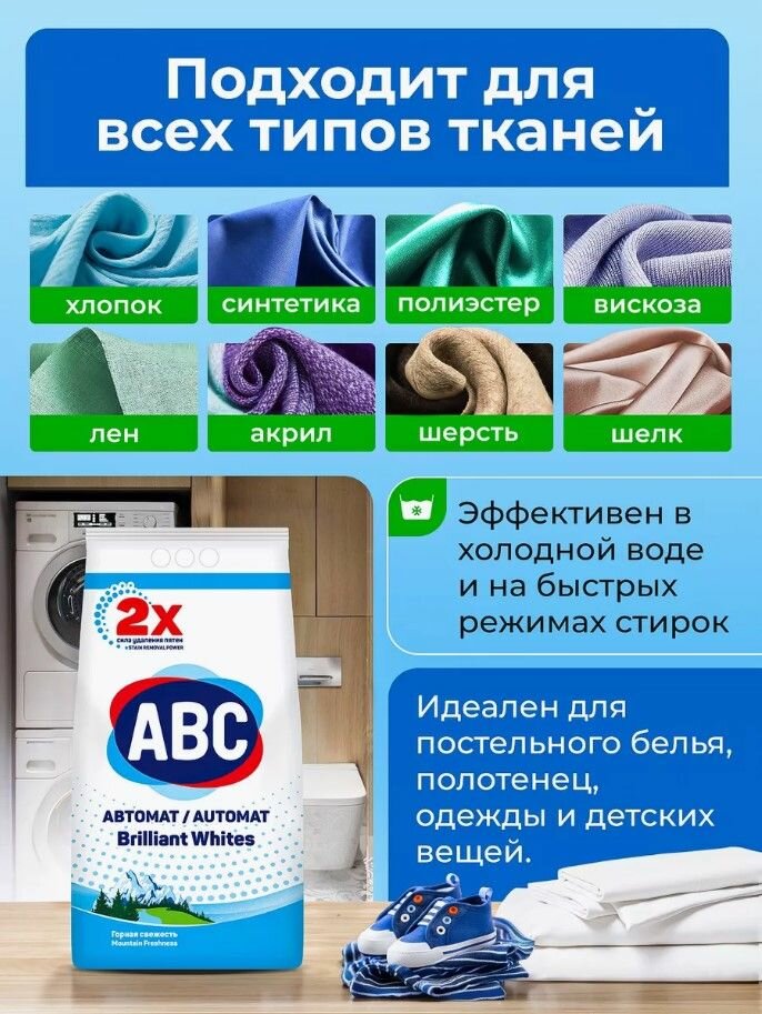 Стиральный порошок АВС предназначен для стирки белого белья , удаляет стойкие загрязнения, аромат свежести , защита волокон