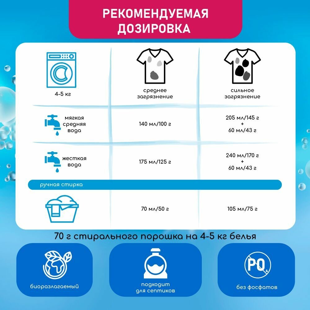 1. Безопасный состав: не содержит фосфатов и других вредных веществ, которые могут вызывать аллергические реакции и раздражение кожи. 2. Эффективный результат: обеспечивает отличное качество стирки и удаляет все загрязнения даже при низких температурах. 3. Приятный аромат: имеет нежный цветочный аромат, который не раздражает глаза и легкие. 4. Экономичность: одной упаковки порошка хватит на долгое время, так как он очень экономичен в использовании. 5. Подходит для всех типов тканей: подходит для стирки как деликатных тканей, так и для грубых материалов. 6. Удобная упаковка: большая упаковка весом 9 кг позволяет сэкономить на покупке и использовать порошок на долгое время. 7. Доступная цена: цена на данный продукт является одной из самых доступных на рынке.