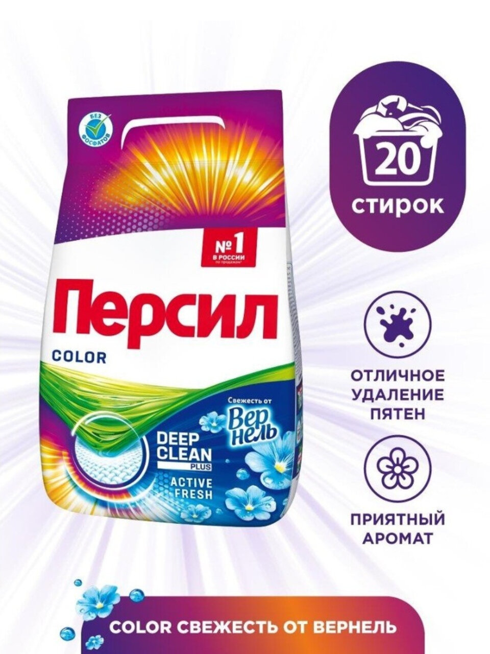 Стиральный порошок Персил Color Свежесть от Vernel предназначен для цветного белья и обеспечивает высокую эффективность стирки благодаря формуле Deep Clean Plus с уникальным сочетанием 13 активных компонентов: