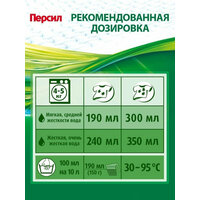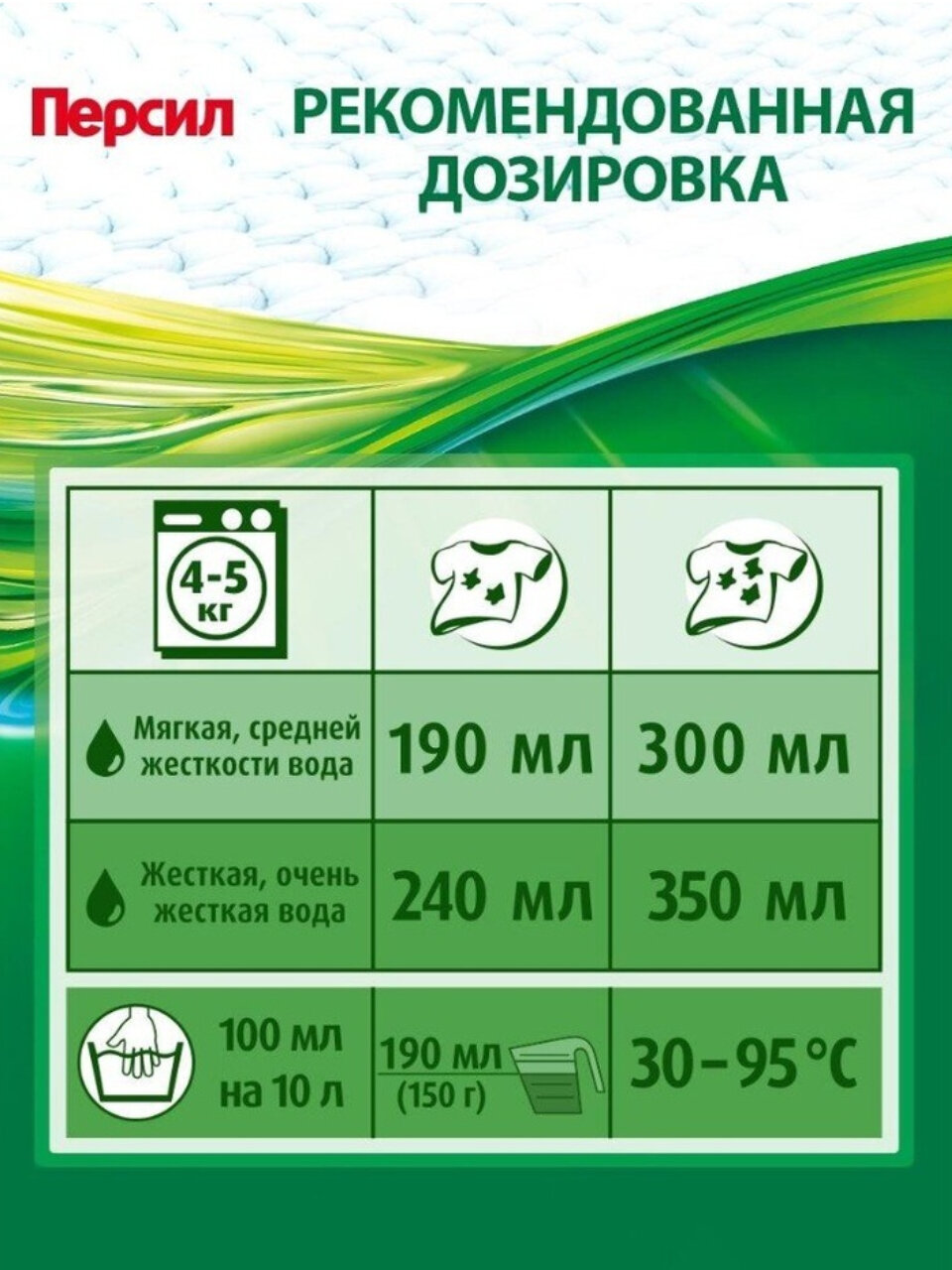 Рекомендованная дозировка при стирке 4-5 кг белья в воде мягкой или средней жесткости: 190 мл = 150 г.