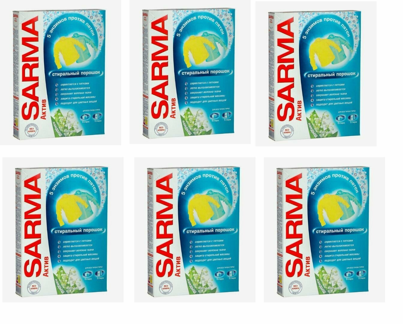 Стиральный порошок SARMA Актив, Ландыш, 5 энзимов против пятен, 400 г, 6 шт: сравнение цен, характеристики, фото, актуальное наличие и цены.
