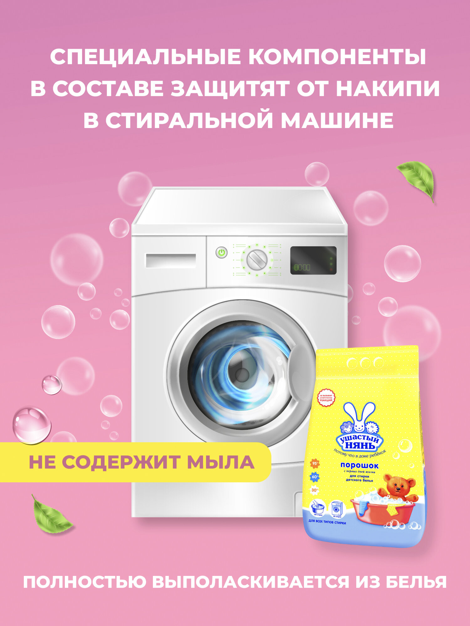 Стиральный порошок "Ушастый нянь" разработан для стирки белья и одежды детей любого возраста, в том числе новорожденных. Также подходит для стирки одежды людей с чувствительной кожей. начинает действовать уже в процессе замачивания и удаляет загрязнения даже в воде низкой температуры; эффективно справляется с широким спектром загрязнений, удаляет пятна от молока, яиц, фруктовых пюре, соков, каш, а также от продуктов жизнедеятельности малышей; подходит для стирки белья из хлопчатобумажной, льняной, синтетической ткани, а также тканей из смешанных волокон (кроме натурального шелка и шерсти); мягкие отбеливатели и низкий pH не повреждают структуру волокон тканей, что позволяет сохранить первоначальный вид одежды в процессе многократных стирок; порошок не содержит мыла, что позволяет ему полностью и без труда выполаскиваться из белья; нежный запах порошка сделает стирку приятной, но не останется на белье; специальные компоненты в составе защитят нагревательные элементы стиральной машины от накипи.