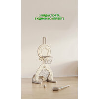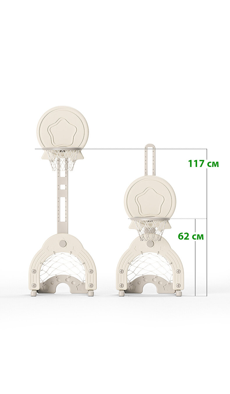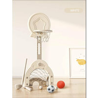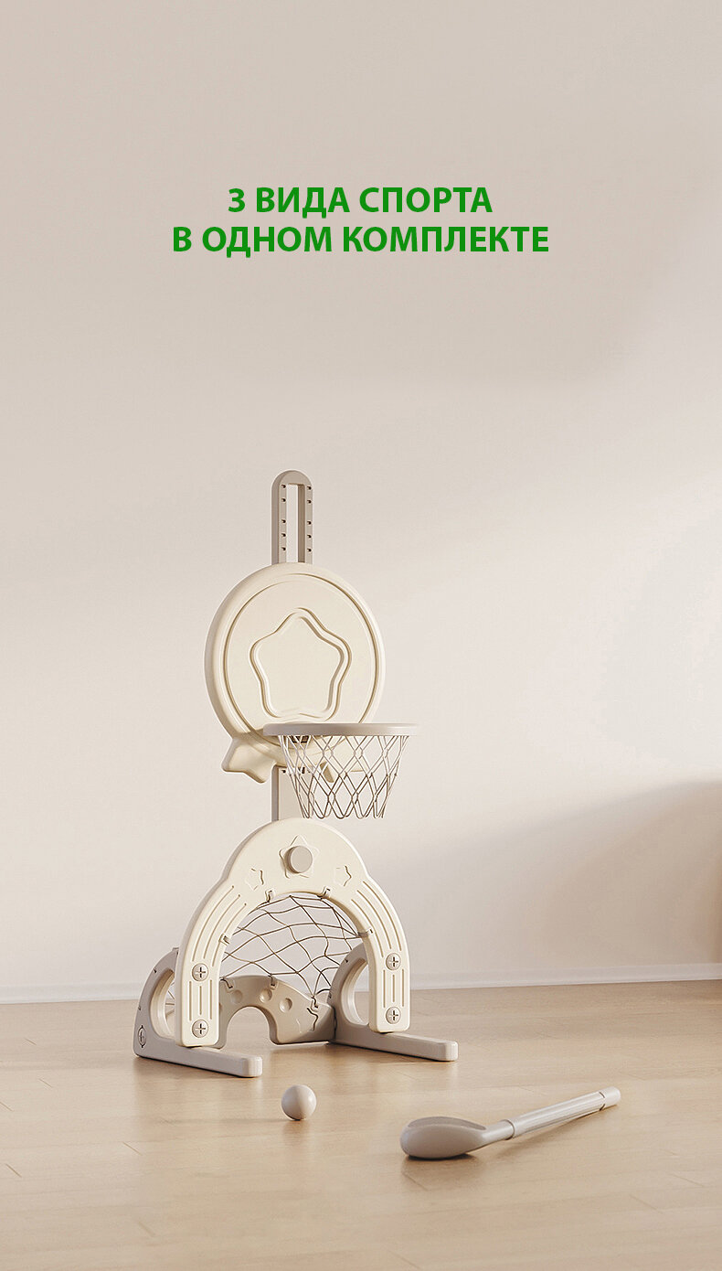 Детская баскетбольная стойка Perfetto sport 3 в 1 – идеальный досуг для детей. Это настоящий мини игровой комплекс, включающий в себя баскетбольную корзину, футбольные ворота, и отверстие для игры в гольф. В набор входят: мяч для баскетбола, мяч для футбола, мяч для гольфа и клюшка. Стойка изготовлена из высокопрочного термостойкого пластика, поэтому она подойдет для дома и для улицы. Многоуровневая регулировка высоты - позволит точно подстроиться под рост и возможности малыша. Для устойчивости предусмотрено водоналивное основание – для заполнения водой или песком. Баскетбольное кольцо возможно установить с обеих сторон, что позволит играть сразу двум малышам - одному в баскетбол, а другому в гольф или футбол.\nНабор для спортивных игр дает возможность развивать ребенку навыки ловкости, внимательности и координации движений, а также знакомят со спортом. Во время активной игры с мячом задействуются все группы мышц, что способствует всестороннему и полному физическому развитию детей и принесёт удовольствие вашему малышу. С таким спортивным аксессуаром дома дети надолго забудут про гаджеты и будут проводить время с пользой. Стойка станет желанным подарком для мальчиков и девочек от 1,5 до 5 лет.\nСтрана происхождения: Китай\nСпособ установки: на горизонтальную поверхность\nМатериал: пластик\nИзготовлено: высокопрочный термостойкий стеклопластик\nЗанимаемая площадь: 0,55 х 0,49 м\nВысота стойки: 0,95 - 1,50 м\nДиаметр кольца: внешний 0,29 м внутренний 0,23 м\nКомплектация: стойка баскетбольная, луза, ворота футбольные с ячейкой для гольфа, мяч 2 шт, мяч для гольфа, клюшка для гольфа\nВозрастная категория: 2+\nВес: 3,2 кг\nУпаковка: картонная коробка\nРазмеры упаковки (ДхШхВ): \n1 место 0,73 х 0,52 х 0,13 м\n