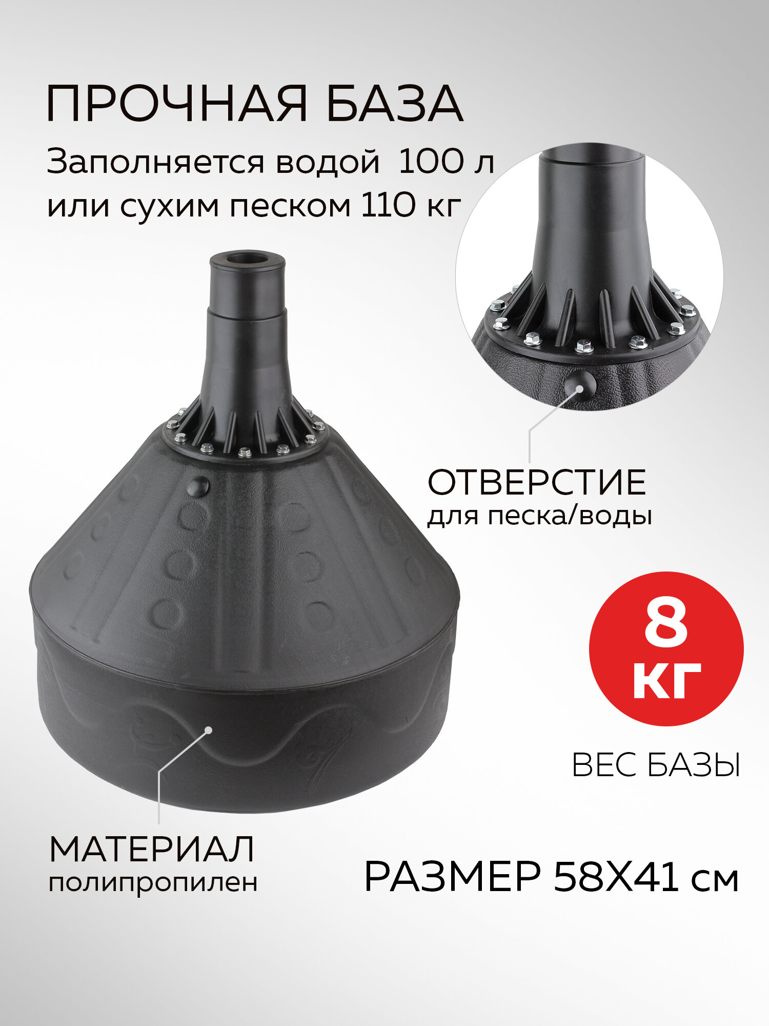 Вес: 34 кг (26 кг - мешок, 8 кг - база) Примечания: Для наполнения базы необходимо 100 л воды или 110 кг песка Размеры мешка: Ø31 х 130 см Материал: поливинилхлорид Наполнитель: пена из полиуретана База: полипропилен Размер базы: Ø58 х 41 см Высота стойки: 170 см
