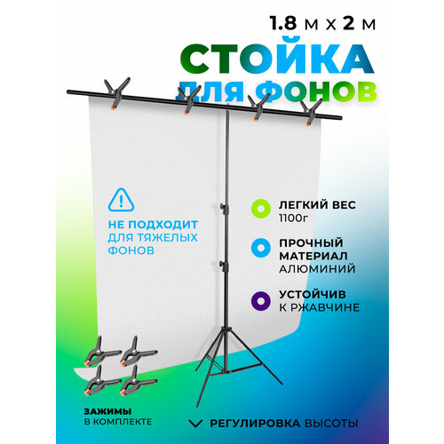 У держателя для фотофона есть регулировка высоты, позволяющая настроить его под нужные параметры. При этом размеры изделия равняются 2 м по ширине и 1.8 м по длине, что обеспечивает комфортное использование в различных условиях съемки.