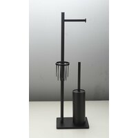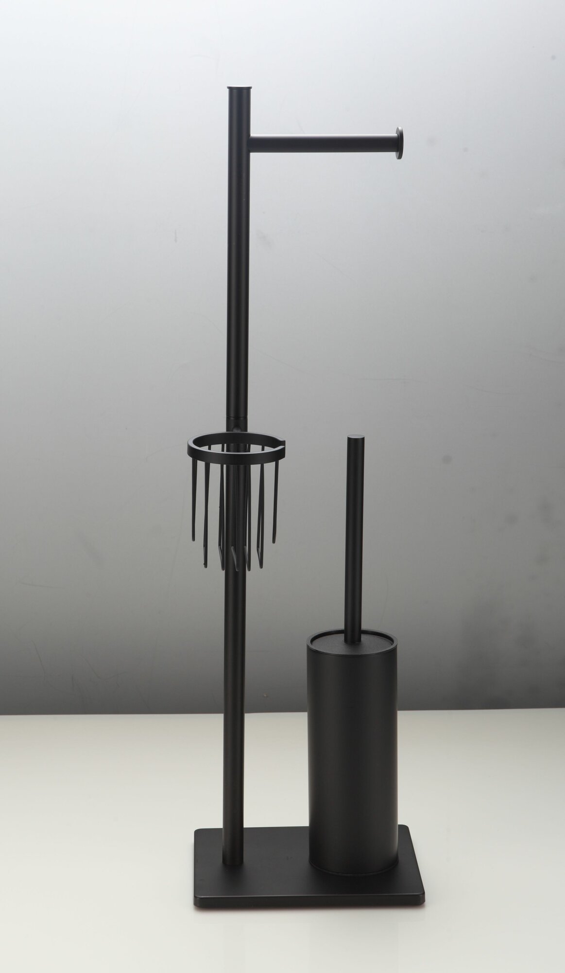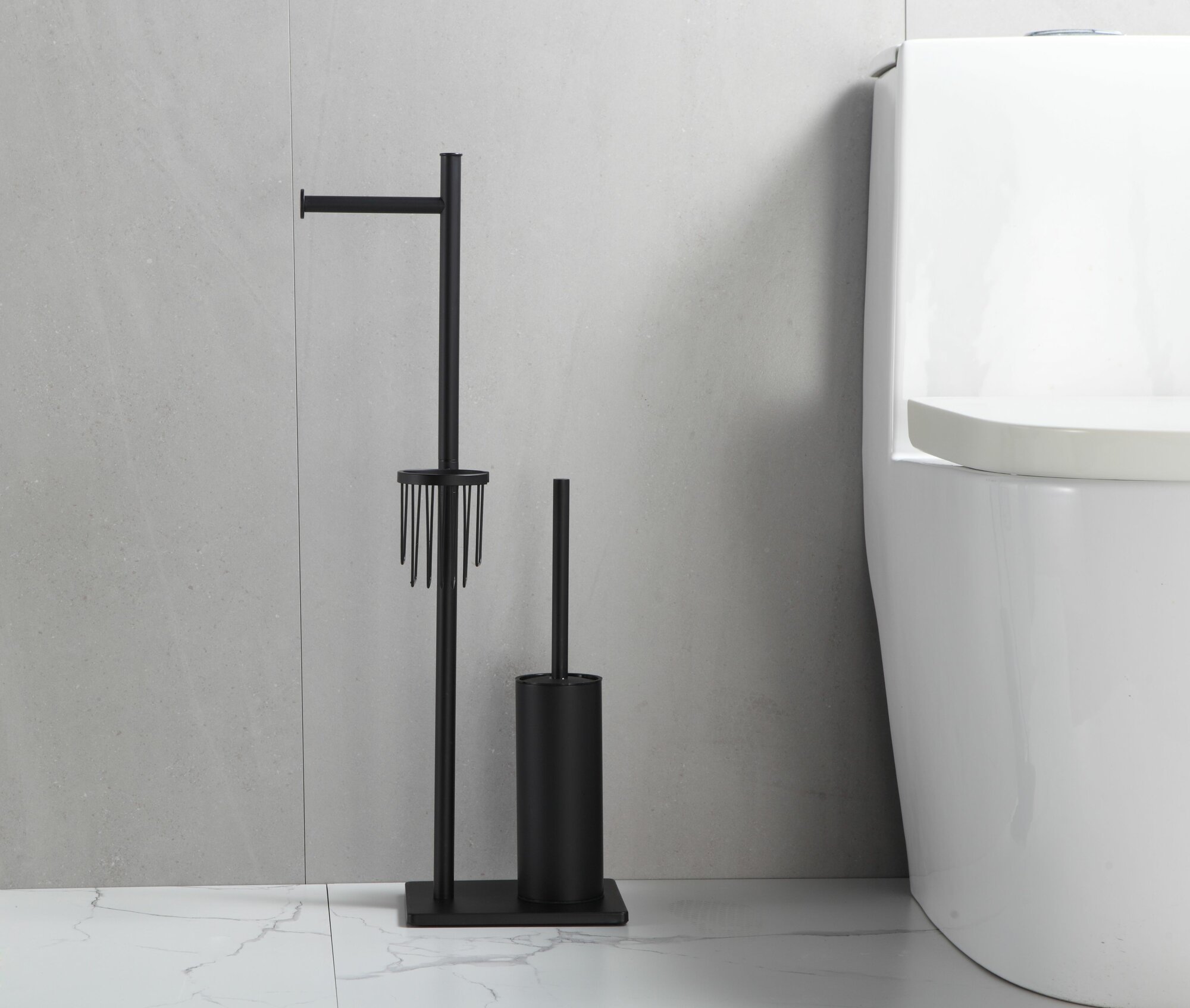 Напольная стойка с держателем для ершика, бумаги и освежителя - прекрасное решение организации пространства в любом интерьере. Изделие состоит из держателя туалетной бумаги, ершика с ручкой, щетки с жестким густым ворсом и подставки, держателя для освежителя воздуха. Кроме того в комплекте дополнительно щетка для ершика в подарок! Эта стойка в туалет напольная устойчива и надежна. Стойка для ванной комнаты изготовлена из высококачественного металла, устойчивого к проявлению элементов коррозии. Щетка для ершика изготовлена из долговечного влагоустойчивого материала. Изделие имеет изысканное матовое или классическое хромированное покрытие, что делает его стильным и универсальным аксессуаром для Вашей ванной. Компактность – еще одно ключевое преимущество нашей стойки. Она идеально подходит для небольших туалетных комнат, объединяя несколько функций в одном устройстве. Дополнительная щетка для ершика в подарок! Высота общая - 69.6 см Длина подставки для ершика- 20 см Ширина - 16 см. Цвет черный матовый