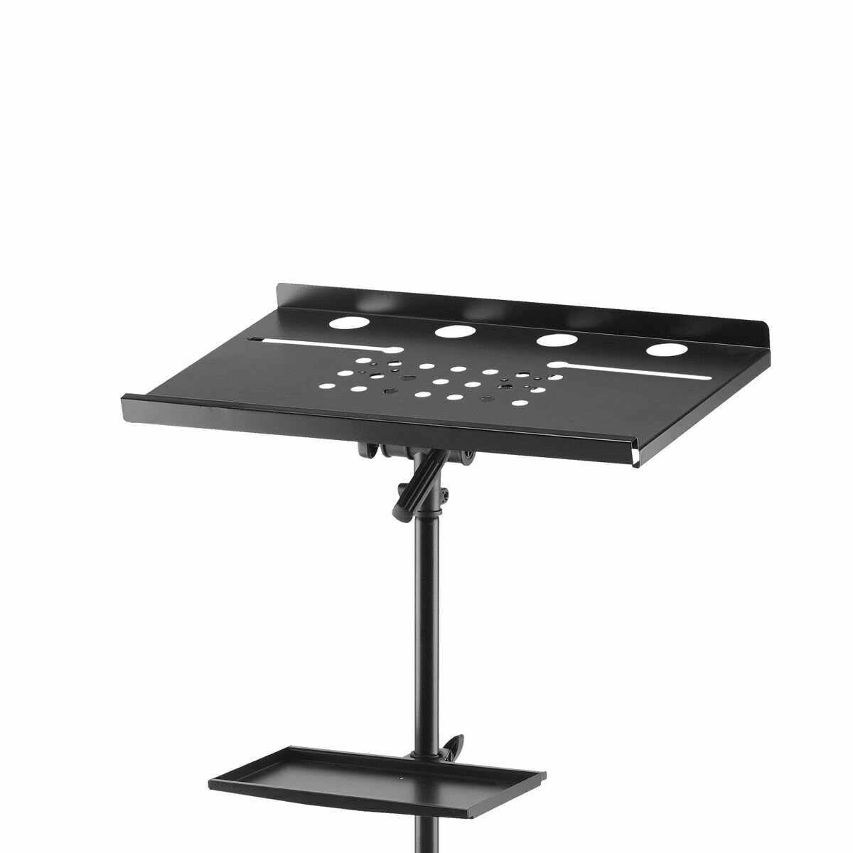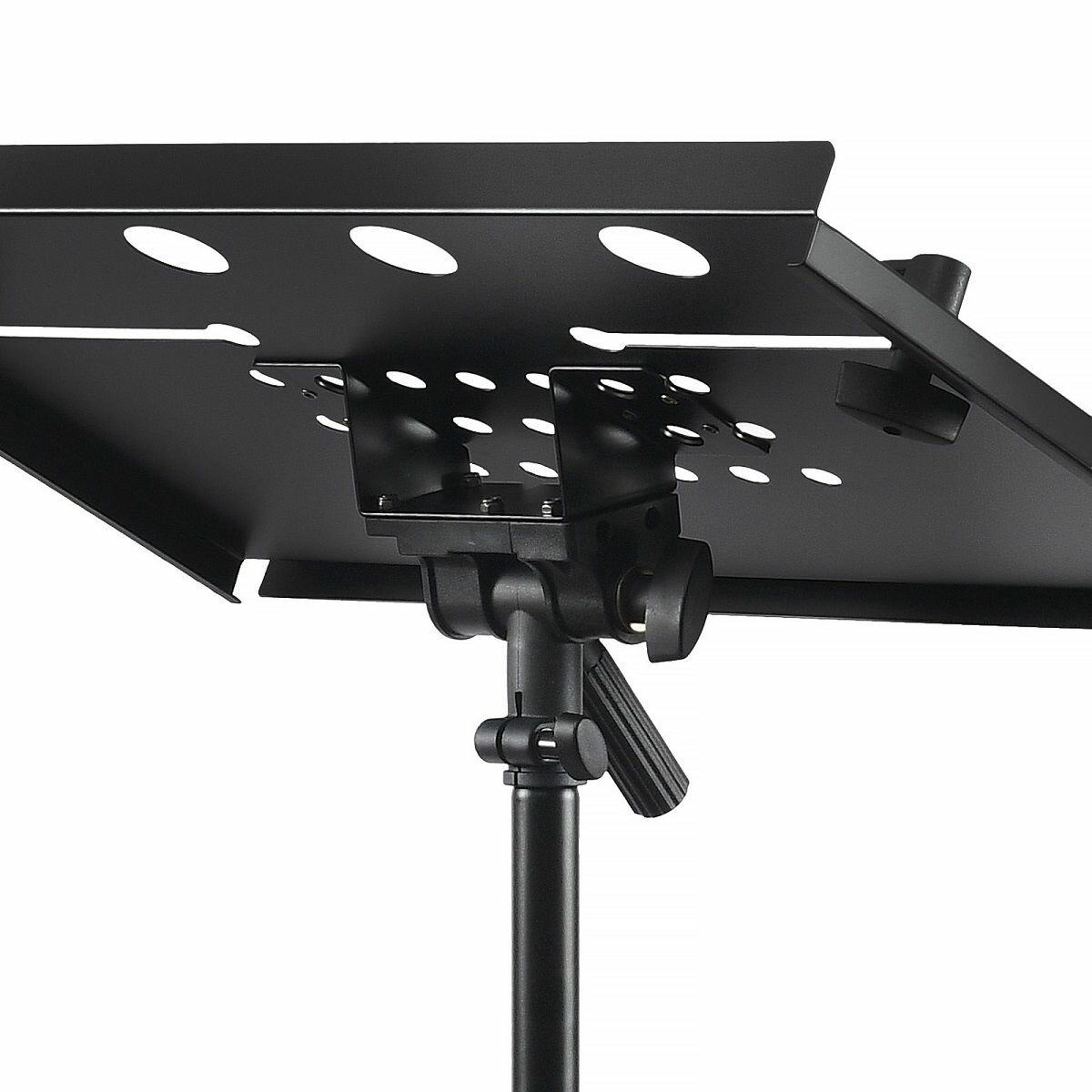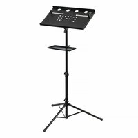 Стойка для ноутбука с дополнительным лотком для аксессуаров - металлическая тренога с нескользящими резиновыми ножками. Подставка регулируется по углу наклона и высоте. Стопорные винты фиксируют ноутбук, предотвращая соскальзывание. Модель оснащена торцевой регулировкой для стабилизации подставки на неровных поверхностях.