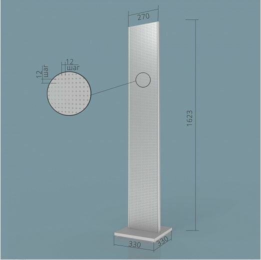 Торговая металлическая перфорированная стойка – компактное и эффективное в эксплуатации оборудование для торговых залов, магазинов, выставочных центров, демонстрационных залов. Стойка Стэлла выгодно представит как раздаточный рекламный товара, так и товар для продажи. Важным преимуществом перфорированной стойки является возможность её размещения различными способами: в качестве островных стеллажей, рядом друг с другом (встык) или же вплотную к стене. Широкое устойчивое основание не даст стойке опрокинуться. Размеры основания - 330х300 мм Шаг перфорации - 12 мм; диаметр перфорации - 5 мм Разборная конструкция - собирается путем закрепления основной части на основании Качественная порошковая окраска надолго сохранит прекрасный внешний вид торгового оборудования Высота стойки 1623 мм Цвет серый металлик