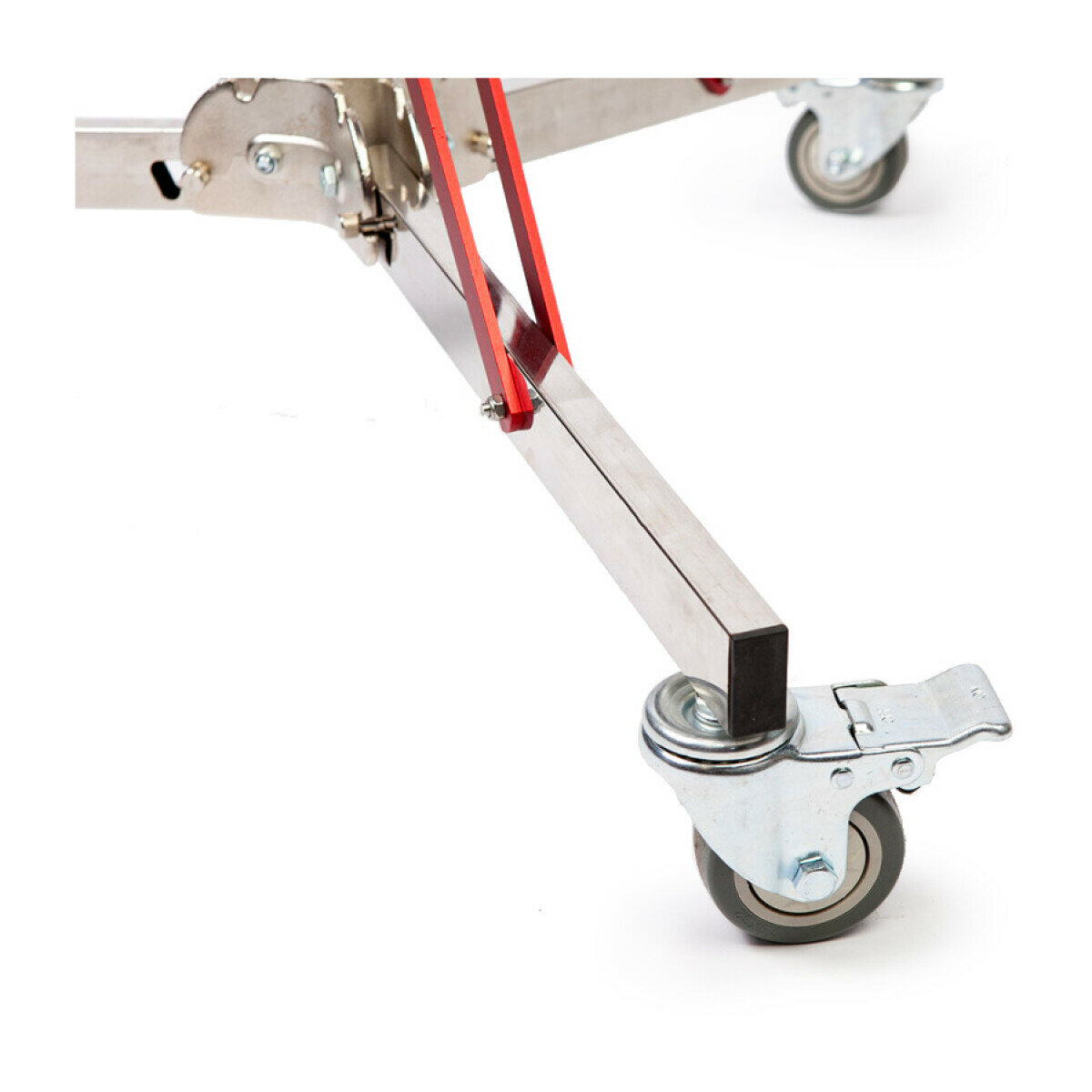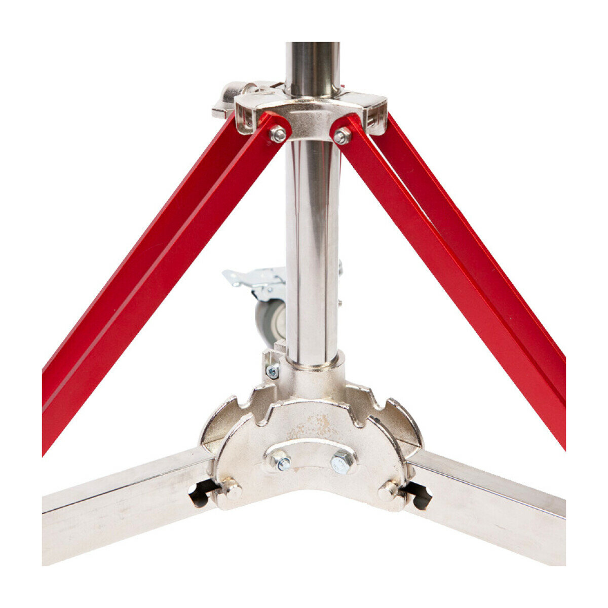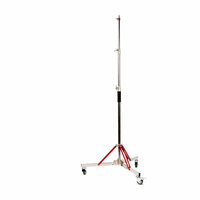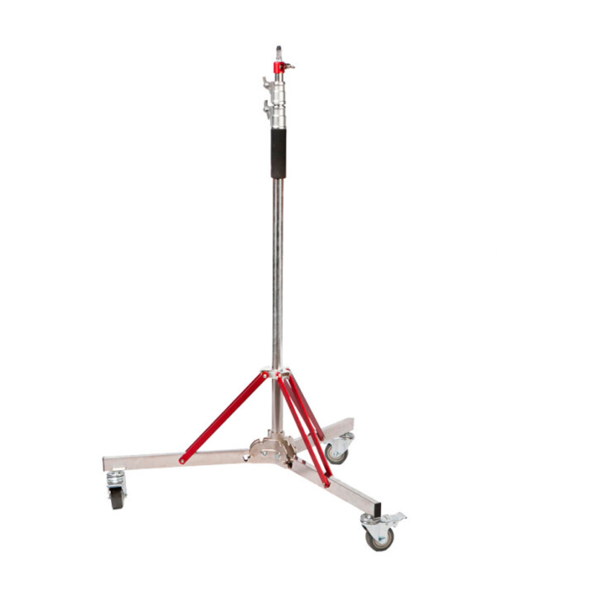 Эта стойка отличается своей компактностью в сложенном виде благодаря тому, что ее ноги складываются в обратном направлении. Колеса позволяют легко перемещать стойку, а также могут быть транспортированы отдельно. Пружинный амортизатор обеспечивает защиту оборудования от вибраций и ударов. Стандартный съемный палец имеет диаметр присоединения насадок 5/8" (16 мм) с резьбами 1/4" и 3/8".
