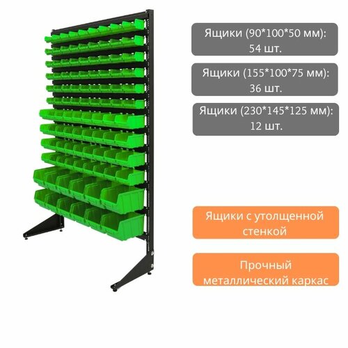Наполнение стеллажа: Ящики (90*100*50 мм): 54 шт. Ящики (155*100*75 мм): 36 шт. Ящики (230*145*125 мм): 12 шт. Всего ящиков: 102 шт. Металлический стеллаж с пластиковыми ящиками предназначен для хранения крепежа и мелких товаров. Стойка окрашена порошковой краской. Ящики изготовлены из полипропилена высокого качества. Надежность конструкции гарантируется. Стеллажи с ящиками идеально подойдут для магазина крепежа, склада или станут хорошим решением при размещении запчастей в гараже. Грузоподъемность – 800 кг. Стеллаж показывает высокое качество эксплуатации, даже при полной загрузке ящиков.