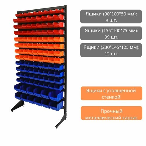 Наполнение стеллажа: Ящики (90*100*50 мм): 9 шт. Ящики (155*100*75 мм): 99 шт. Ящики (230*145*125 мм): 12 шт. Всего ящиков: 120 шт. Металлический стеллаж с пластиковыми ящиками предназначен для хранения крепежа и мелких товаров. Стойка окрашена порошковой краской. Ящики изготовлены из полипропилена высокого качества. Надежность конструкции гарантируется. Стеллажи с ящиками идеально подойдут для магазина крепежа, склада или станут хорошим решением при размещении запчастей в гараже. Грузоподъемность – 800 кг. Стеллаж показывает высокое качество эксплуатации, даже при полной загрузке ящиков.