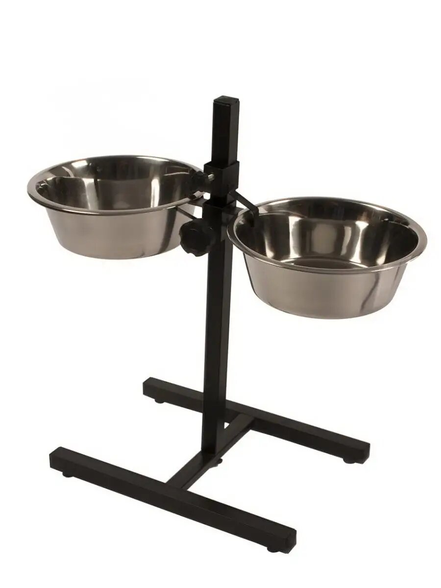 Устойчивая и прочная конструкция с двумя мисками из нержавеющей стали. Высота мисок регулируется, противоскользящие ножки, специальные держатели предотвращающие опрокидывание миски.