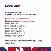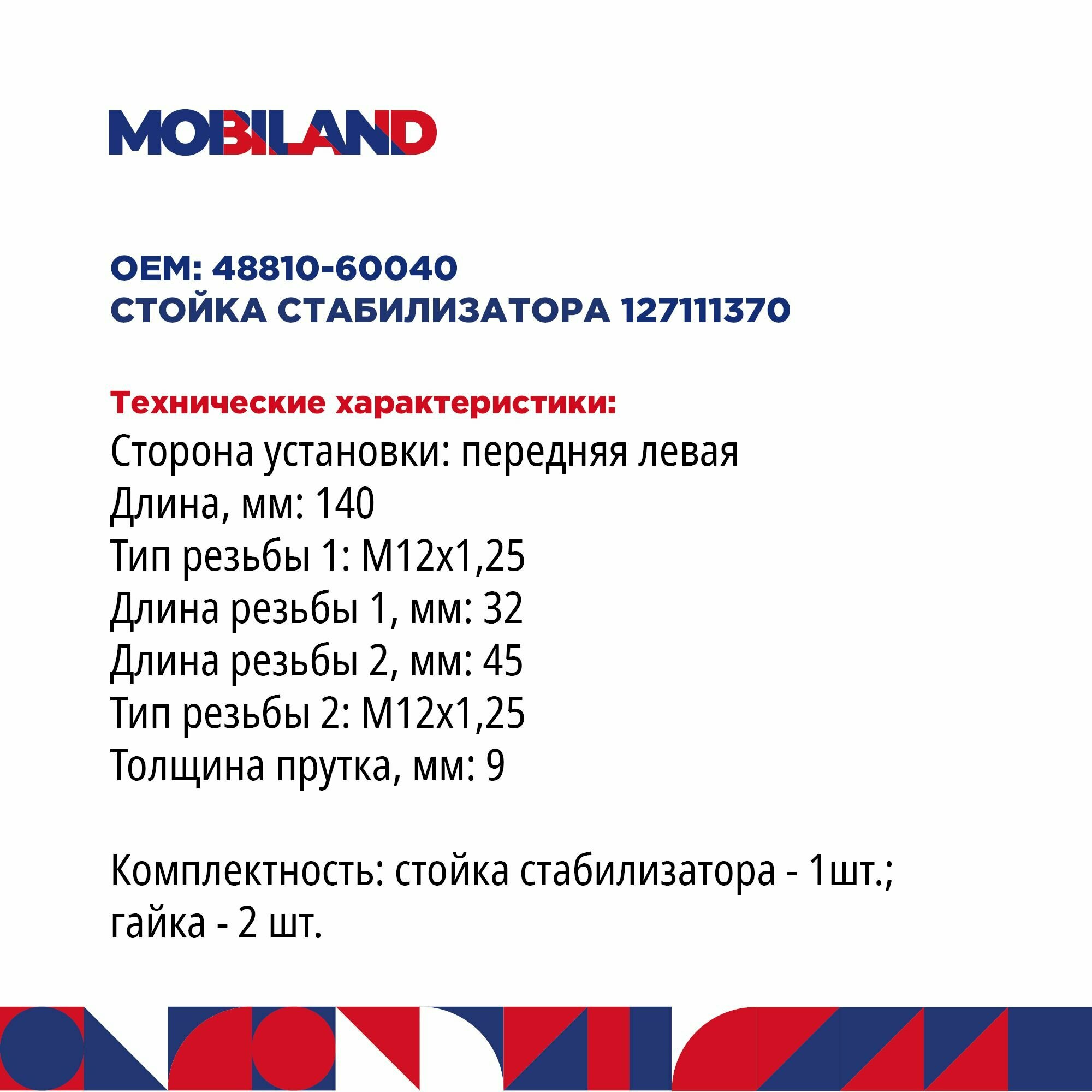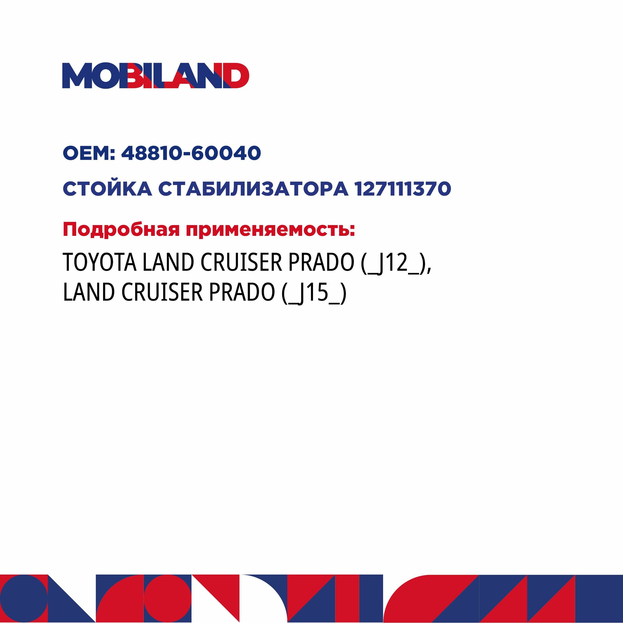 Купить Стойка стабилизатора переднего левая для а/м TOYOTA LAND CRUISER PRADO, MOBILAND 127111370 с доставкой по всей России. Стойка стабилизатора переднего левая для а/м TOYOTA LAND CRUISER PRADO, MOBILAND 127111370: сравнение цен, характеристики, фото, актуальное наличие и цены.