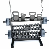 Стойка с тремя полками позволяет хранить гантели любого размера (от 0.5кг до 50кг). Размер одной полки - длинна\ширина 100х30 сантиметров. За счет толщины листового металла 3 миллиметра +ребра жесткости по краям, каждая полка способна выдержать нагрузку до 150 килограмм. Помимо гантелей, на верхнем ярусе вы можете расположить гири.