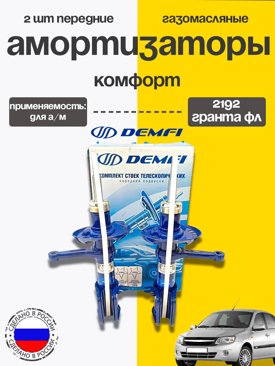 Стойка телескопическая газонаполненная передней подвески для автомобилей семейства ВАЗ 2192. Комплект 2шт. Газонаполненные стойки и амортизаторы DEMFI отличаются от гидравлических избыточным давлением (газ азот), обеспечивая надежный и постоянный контакт колес с дорогой, что положительно влияет на управляемость автомобиля при интенсивном движении по неровной дороге и в периоды отрицательных температур. Серия «Комфорт» - наиболее комфортные из линейки Демфи, надёжные гидравлические и газонаполненные стойки с повышенными характеристиками долговечности. Приемлемый по цене вариант для большинства водителей. За счёт увеличенного усилия отбоя дают ощущение плотно собранной, энергоёмкой подвески для умеренно скоростной езды по городским и загородным дорогам. Стойки и амортизаторы серии «Комфорт» («жесткость» на 10% выше, чем у серийных заводских) специально адаптированы для российских дорог, с целью улучшения управляемости автомобиля.