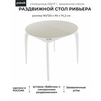 Обеденный стол Ривьера в современном стиле. Столешница дополнена вставкой «бабочка» из стекла, с помощью которой ее длина увеличивается на 30 см. Материал столешницы и вставки: ЛДСП, покрытая закаленным стеклом. Материал подстолья: ЛДСП Механизм трансформации: синхронно-раздвижной Размер стола в сложенном виде (ВхШхГ) см: 74х90х90 Размер стола в разложенном виде (ВхШхГ) см: 74 х 120 х 90 Цвет столешницы: Капучино Цвет ножек: белый Гарантия 12 месяцев Производство Россия