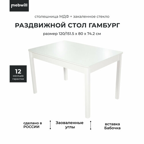 Кухонный, обеденный стол Гамбург СВ раздвижной, массив березы, 120х80х74 см, Стекло Белое / Опоры Белые: сравнение цен, характеристики, фото, актуальное наличие и цены.