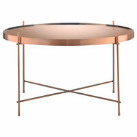 Материалы: столешница – розовое зеркало, каркас – сталь с медным покрытием. Размеры: диаметр – 64,4 см, высота – 38 см.