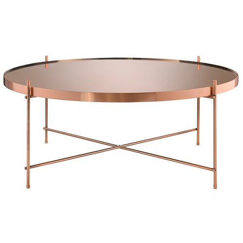 Материалы: столешница – розовое зеркало, каркас – сталь с медным покрытием. Размеры: диаметр – 84,8 см, высота – 33 см.