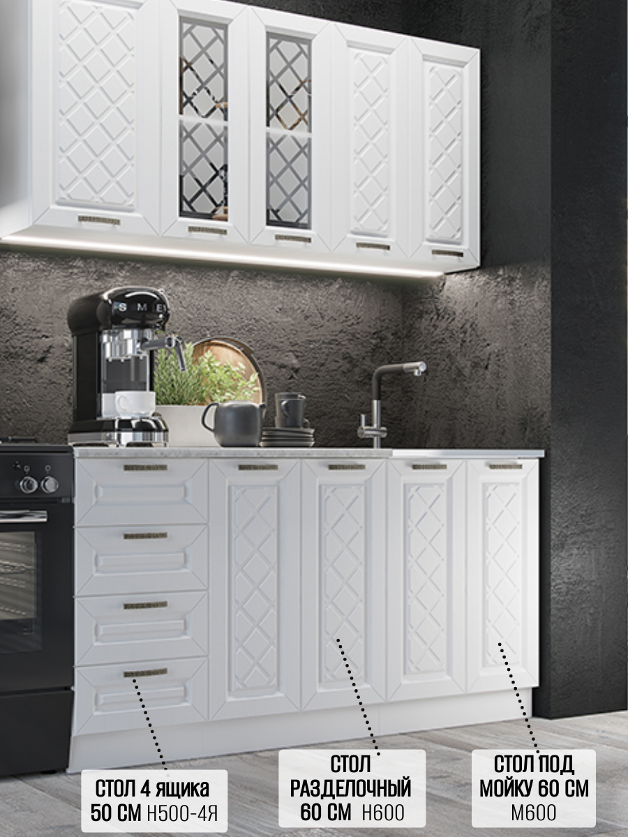 - Дополнительные элементы: регулируемые ножки высотой 10 см, цоколь из ЛДСП, комплект фурнитуры и инструкция по сборке.