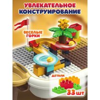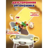Детский игровой развивающий столик для малышей Юный инженер – это компактная детская мебель для игры с конструктором. Игровой пластиковый стол трансформер подойдет мальчикам и девочкам дошкольного возраста. Столик для творчества имеет двухстороннюю рабочую столешницу, одна из сторон ровная и подойдет для занятий, приема пищи, рисования, лепки и игр с песком и крупами, что будет способствовать развитию мелкой моторики. Вторая сторона – представляет собой основу, состоящую из пластины для конструирования. Стол это отличная коробка и ящик для хранения игрушек. Столешницу складной парты развивалки можно легко и быстро изменять под любые игры за столом. Развивающий стол 6 в 1 порадует как девочку, так и мальчика и удивит множеством способов своего применения для развития интеллекта, воображения, памяти, творчества и усидчивости. Можно засыпать кинетического песка, ведь наш столик это отличная песочница. Панель для конструктора большая и комфортная. Все что нужно для игр с вашим ребенком. Ножки стола устойчивые и имеют закругленные углы, что делает наш игрушечный стол безопасным для игр дома и вашего малыша. Товары Play Okay - все для творческого развития вашего ребенка. Как известно, для правильного развития малышам очень важно как можно большее разнообразие деятельности, позволит ребенку играть обучаясь и учиться играя, легко переключаться между занятиями и не даст малышу заскучать. Конструктор и игровой стол развивают ребенка также эффективно как монтессори для малышей. Прекрасная альтернатива таким играм как сортер деревянный монтессори, цилиндры. Конструктор для малышей крупный, состоящий из 33 блоков. Собирая пластиковый конструктор, дети развивают мелкую моторику – элементы требуют четких действий, поэтому ребенок научится концентрироваться и улучшит координацию движений. Игры полезные, интересные и развивают воображение. Конструктор большие детали формирует пространственное мышление: как с помощью инструкции и деталей собрать 3д фигуру из конструктора. Игры с уже собранным пластиковым конструктором расширяют фантазию и мышление, помогают придумывать детям новые сценарии для персонажей. Конструктор позволит собрать целый парк аттракционов где будет цветная горка. Также можно убрать столешницу и освободившуюся емкость наполнить разными наполнителями в виде воды, песка, конструктора и придумывать разные сюжеты для игры. Идеальная домашняя песочница для кинетического песка. А также детская песочница уличная. По бокам стола предусмотрены удобные пластмассовые контейнеры для деталей конструктора, карандашей или игрушек. Столик легко собирается в небольшой кейс, его удобно хранить и брать с собой в поездки. Также можно взять с собой прикольные игрушки в садик. Комплект детской мебели выполнен из прочного abs-пластика, имеет безопасные гладкие скошенные углы и противоскользящие накладки. Конструктор со столом развивайка не требует особого ухода, за ней легко ухаживать – не боится влаги и грязи. Столик с конструктором хорошо совместим с наборами Duplo. Стол для настольных игр подарочный - все что нужно для развития и веселья. Стол игровой и развивашки отличный универсальный подарок вашему любимому малышу на день рождения, 8 марта и 23 февраля, Новый год или Рождество. Подойдет как для мальчика, так и для девочки