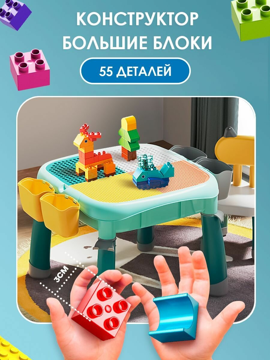 Детский развивающий столик для малышей – это компактная детская мебель для игры с конструктором. Игровой пластиковый стол трансформер подойдет мальчикам и девочкам дошкольного возраста. Столик для творчества имеет двухстороннюю рабочую столешницу, одна из сторон ровная и подойдет для занятий, приема пищи, рисования, лепки и игр с песком и крупами, что будет способствовать развитию мелкой моторики. Вторая сторона – представляет собой основу, состоящую из пластины для конструирования. Столешницу складной парты можно легко и быстро изменять под любые игры за столом. Ножки стола регулируются по высоте и будут расти вместе с вашим малышом. Дополнительные вставки для игрового столика позволят увеличить высоту на 4 см. Игровой развивающий столик легко и быстро собирается и разбирается. В складном состоянии не занимает много места. В комплектацию развивающего столика входят: Вместительный ящик под рабочей панелью, который подойдет для хранения книжек и раскрасок, для веселых игр с кинетическим песком или водой. Специально для таких развлечений столешница оснащена водонепроницаемой заглушкой. Детский стул для столика. Маленький стульчик со спинкой обеспечит ровную осанку на протяжении всей игры. Навесные вращающиеся контейнеры для хранения деталей конструктора, мелких игрушек и письменных принадлежностей. Конструктор для малышей крупный, состоящий из 55 блоков. Обратите, пожалуйста, внимание, что платформой для конструктора является сама столешница стола. Не переживайте, если малыш потеряет детали, ведь они полностью совместимы с конструкторами других известных брендов. Собирая пластиковый конструктор, дети развивают мелкую моторику – элементы требуют четких действий, поэтому ребенок научится концентрироваться и улучшит координацию движений. Конструктор большие детали формирует пространственное мышление: как с помощью инструкции и деталей собрать 3д фигуру из конструктора. Игры с уже собранным пластиковым конструктором расширяют фантазию и мышление, помогают придумывать детям новые сценарии для персонажей. Комплект детской мебели выполнен из прочного abs-пластика, имеет безопасные гладкие скошенные углы и противоскользящие накладки. Столешница не требует особого ухода, за ней легко ухаживать – не боится влаги и грязи. Стол для игр отличается интересным милым дизайном в виде цветочков и ушек, который точно понравится девочкам и мальчикам. В нашем каталоге WiMi вы сможете посмотреть другие модели детских столов и стульев для малышей, в том числе и растущие столы со стульчиками и пластинами как для крупных, так и для классических деталей. А также выбрать в дополнение к игровому столу крупный конструктор для девочек и мальчиков. Это отличный подарок на любой праздник для малышей и детей от 3 лет. Мы будем рады, если вы поделитесь фото и отзывом.