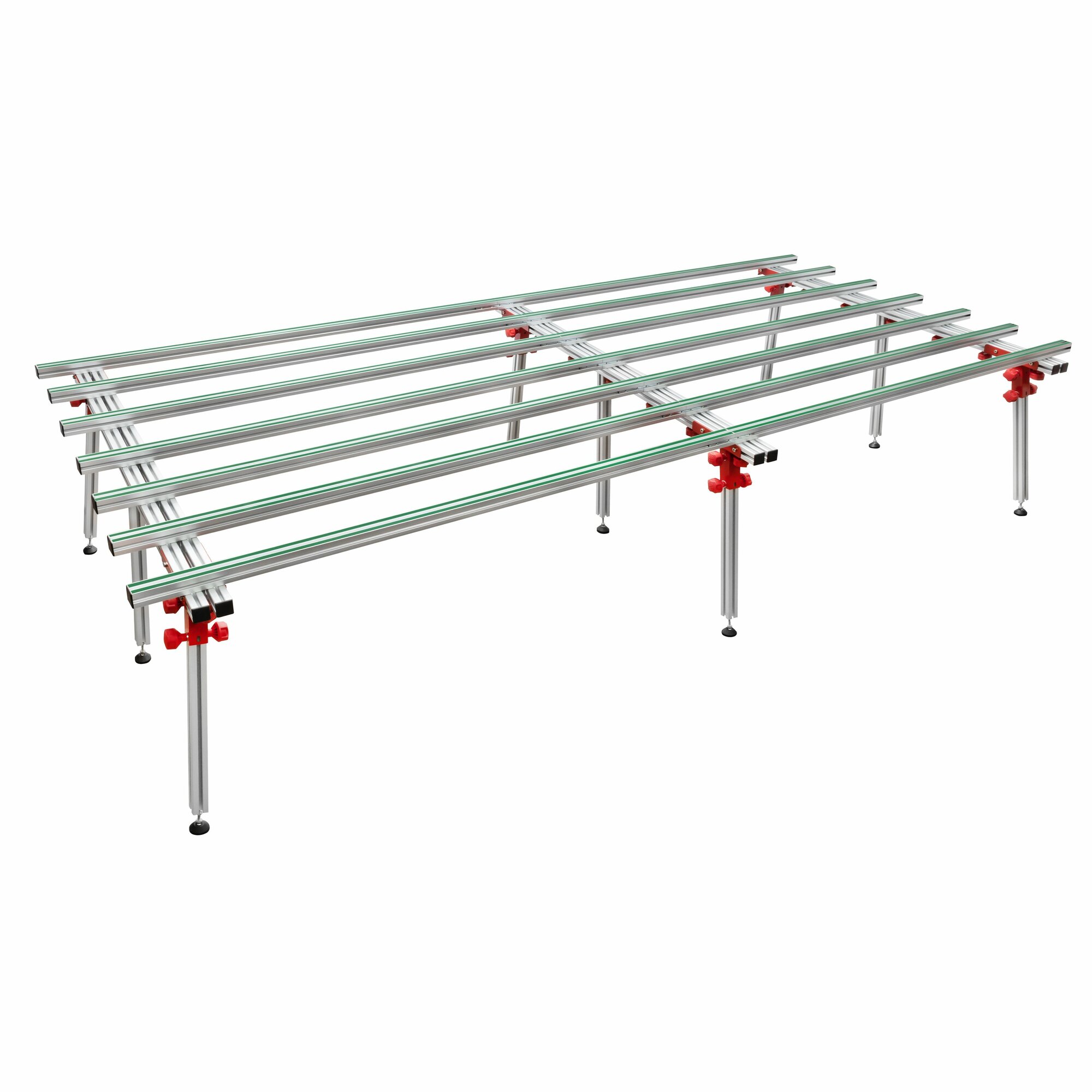 Важной особенностью данного стола является его конструкция, которая состоит из полноценного стола и приставки к нему. Основной стол имеет длину 1800мм, но при использовании приставки её можно увеличить до 3600мм. Покупать такой стол выгоднее чем покупать отдельно два стола чтобы иметь рабочую поверхность 3600мм. Также стоит отметить, что при стыковке направляющих не параллельно, а «елочкой» длину можно регулировать от 2200мм до 3600мм.