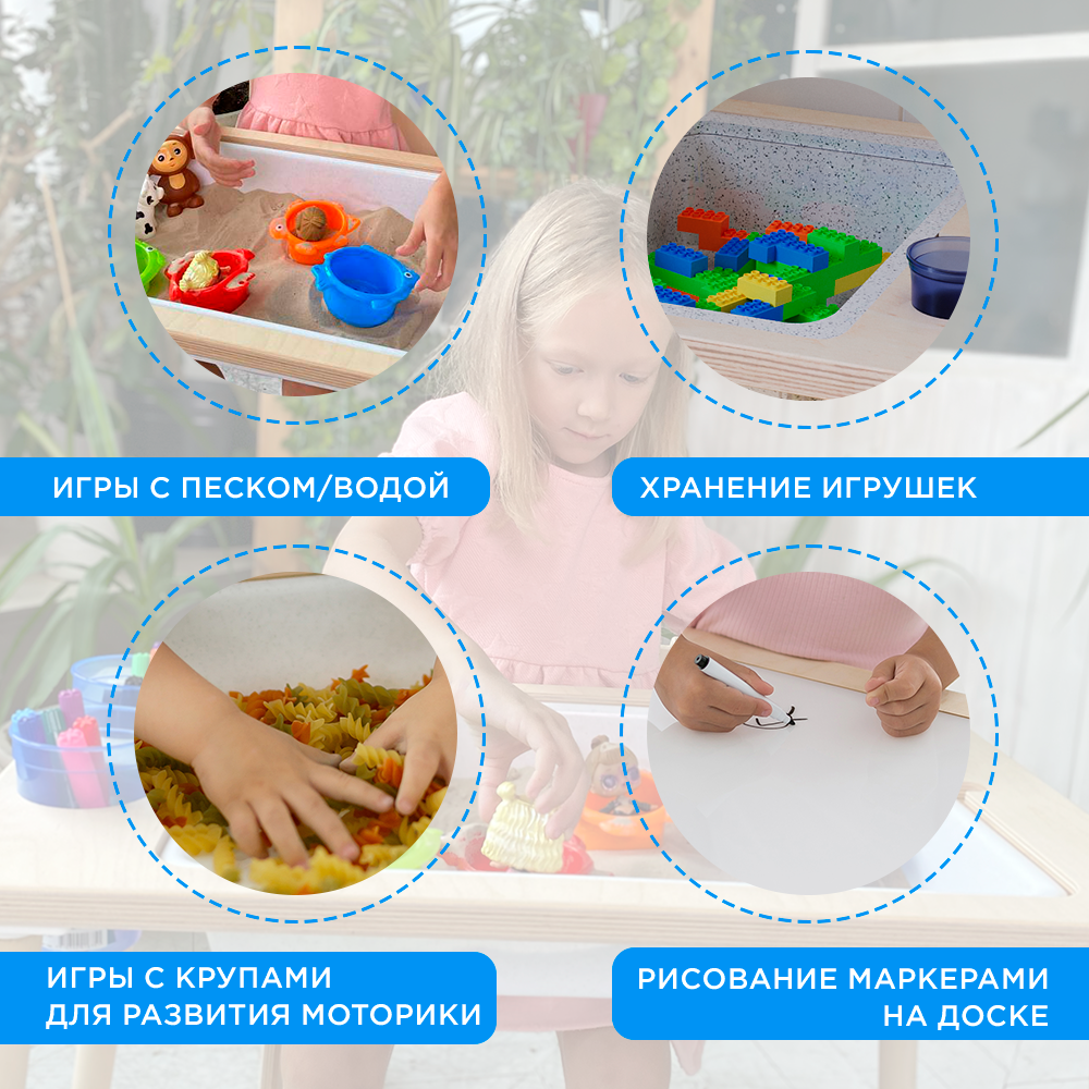 Рисование, занятия творчеством и игры с сыпучими материалами теперь возможны в пределах одного квадратного метра. И всё это без страха уборки с помощью детского стола с удобным контейнером и защитной крышкой. Съёмный контейнер не боится воды, грязи и других детских экспериментов, поэтому его можно в любой момент снять, помыть и вернуть на место.