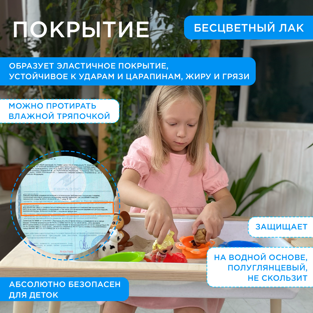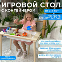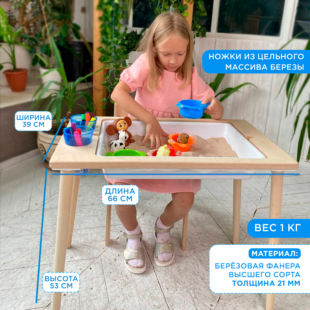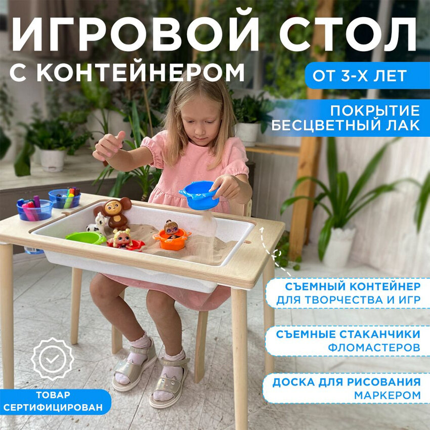 Для защиты изделия от повреждений наносится влагоустойчивое покрытие в виде бесцветного лака или эмали на водной основе. В общем, стол с контейнером - это идеальный подарок на день рождения, новый год или любой другой праздник, который по достоинству оценят дети дошкольного возраста.
