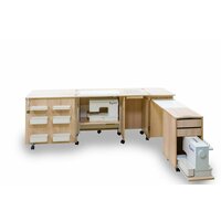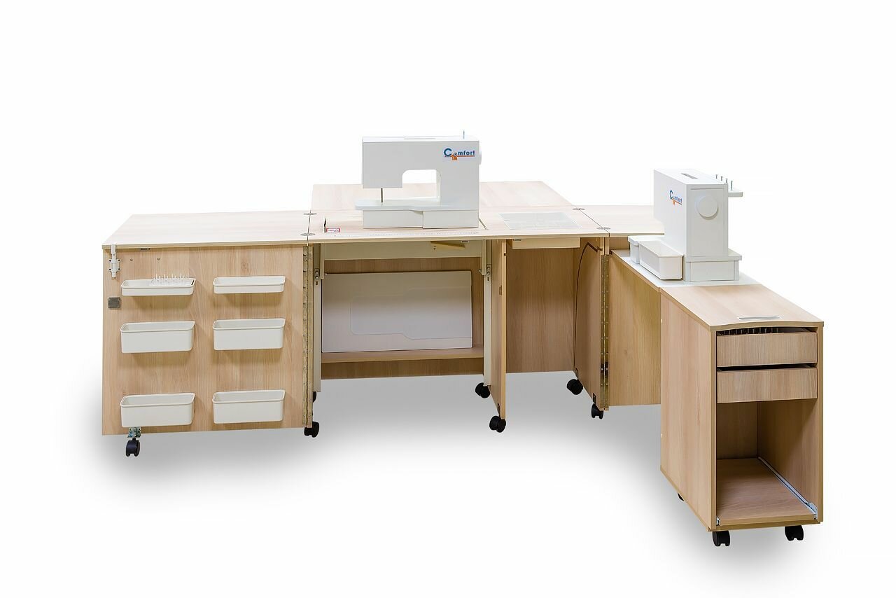 Швейный стол Комфорт 4L-превратит Ваше рабочее пространство в компактный швейный центр. В столе есть место для хранения швейной машины и оверлока. Данная модель оснащена подъемным механизмом до 17кг, который имеет 3 уровня. На открывающейся дверце органайзеры для швейных аксессуаров. Стол Комфорт 4L с пневмолифтом до 17кг подходит для большинства швейных машин. Благодаря колёсикам, рукодельница с лёгкостью переместит стол в любое удобное место. Специальные стопоры позволяют сделать его неподвижным при эксплуатации. Стол имеет 2 выдвижных ящика для хранения различной швейной фурнитуры. Так же есть дополнительная поверхность для кроя. Габариты в сложенном виде-1128*572*780мм; Габариты в разложенном виде-2113*2290*763мм; Размер поверхности для кроя-1128*682мм; Проем под машинку-610*305*415мм; Проем под оверлок-292*400*384мм; Грузоподъемность механизма-10-17кг. Поставка-в разобранном состоянии. Инструкция по сборке прилагается. Стол изготовлен из ЛДСП 16мм. Кромка ПВХ 2мм по лицевой части столешницы, 0,4мм по остальным поверхностям. Наполнение: - механизм подъема 10-17кг – 1шт; - навесные контейнеры: большие – 4шт, малые – 2шт; - подставка под катушки (на 12шт) – 1шт; - подставка под катушки обрезная (на 56шт) – 1шт; - глубокий секционный контейнер – 1шт; - прозрачная вставка (закрывает контейнер) – 1шт; - выдвижной ящик – 2шт; - раскройная поверхность; - колеса: со стопором – 2шт, без стопора –12шт. (Вставки для шитья и для кроя в комплектацию не входят!)
