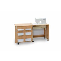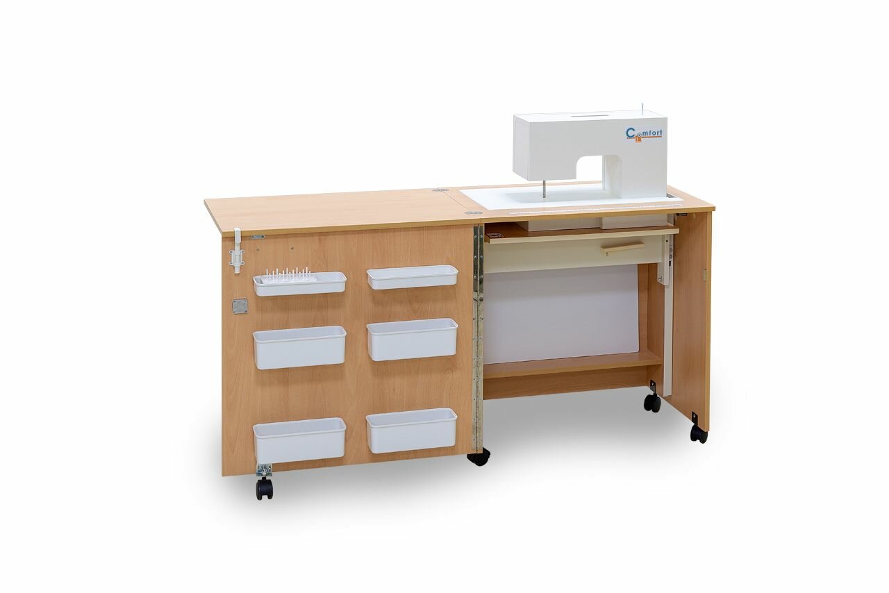Швейный стол Комфорт 1 превратит Ваше рабочее пространство в компактный швейный центр с местом для хранения швейной машины. На открывающейся дверце имеются лотки для швейных принадлежностей. Данная модель оснащена подъемным механизмом до 10 кг, который имеет 3 уровня и подходит для большинства бытовых швейных машин. Благодаря колёсикам, рукодельница с лёгкостью переместит стол в любое удобное место. Специальные стопоры позволяют сделать его неподвижным при эксплуатации. Габариты в сложенном виде-595*487*780мм; Габариты в разложенном виде-1192*487*763мм; Проем под машинку-465*303*305мм; Стол изготовлен из ЛДСП 16мм. Кромка ПВХ 2мм по лицевой части столешницы, 0,4мм по остальным поверхностям. Наполнение: - механизм подъема до 10кг – 1шт; - навесные контейнеры: большие – 4шт, малые – 2шт; - подставка под катушки (на 12шт) – 1шт; - колеса: со стопором – 2шт, без стопора – 3шт. (Вставки для шитья и для кроя в комплектацию не входят!)